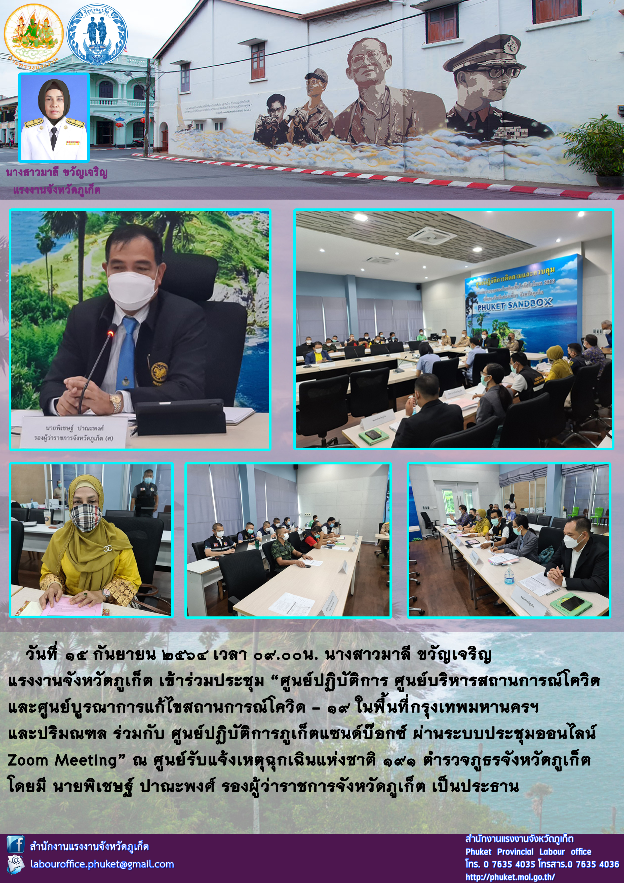 นางสาวมาลี ขวัญเจริญ แรงงานจังหวัดภูเก็ต เข้าร่วมประชุม “ศูนย์ปฏิบัติการ ศูนย์บริหารสถานการณ์โควิด และศูนย์บูรณาการแก้ไขสถานการณ์โควิด – 19 ในพื้นที่กรุงเทพมหานครฯ และปริมณฑล ร่วมกับ ศูนย์ปฏิบัติการภูเก็ตแซนด์บ๊อกซ์ ผ่านระบบประชุมออนไลน์ Zoom Meeting”