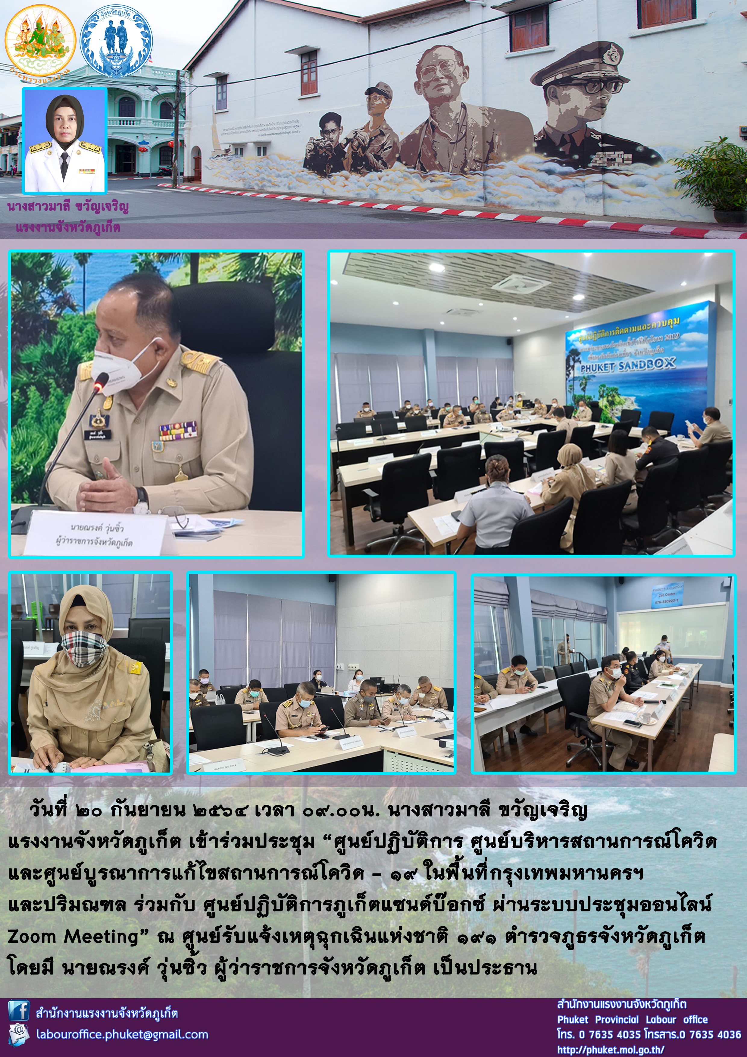 นางสาวมาลี ขวัญเจริญ แรงงานจังหวัดภูเก็ต เข้าร่วมประชุม “ศูนย์ปฏิบัติการ ศูนย์บริหารสถานการณ์โควิด และศูนย์บูรณาการแก้ไขสถานการณ์โควิด – 19 ในพื้นที่กรุงเทพมหานครฯ และปริมณฑล ร่วมกับ ศูนย์ปฏิบัติการภูเก็ตแซนด์บ๊อกซ์ ผ่านระบบประชุมออนไลน์ Zoom Meeting”