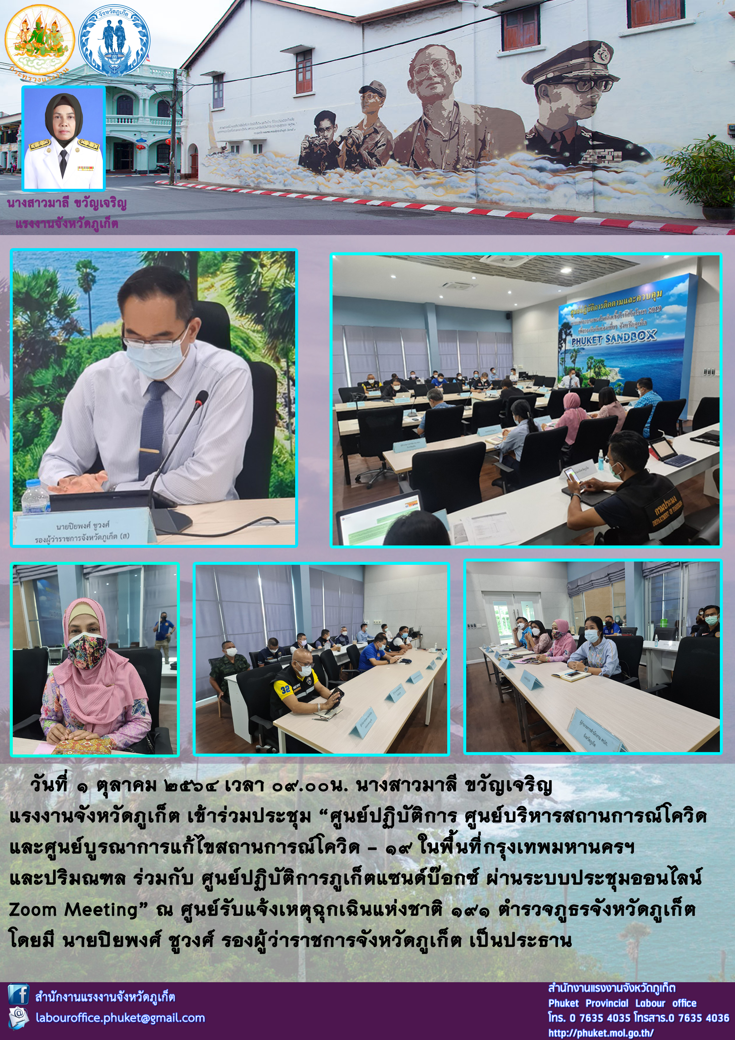 แรงงานจังหวัดภูเก็ต เข้าร่วมประชุม “ศูนย์ปฏิบัติการ ศูนย์บริหารสถานการณ์โควิด และศูนย์บูรณาการแก้ไขสถานการณ์โควิด – 19 ในพื้นที่กรุงเทพมหานครฯ และปริมณฑล ร่วมกับ ศูนย์ปฏิบัติการภูเก็ตแซนด์บ๊อกซ์ ผ่านระบบประชุมออนไลน์ Zoom Meeting”