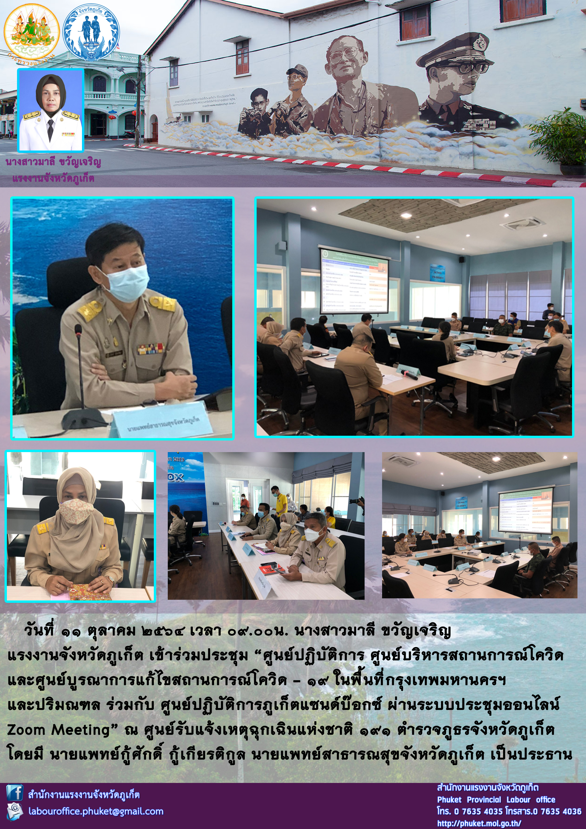 สำนักงานแรงงานจังหวัดภูเก็ต เข้าร่วมประชุม “ศูนย์ปฏิบัติการ ศูนย์บริหารสถานการณ์โควิด และศูนย์บูรณาการแก้ไขสถานการณ์โควิด – 19 ในพื้นที่กรุงเทพมหานครฯ และปริมณฑล ร่วมกับ ศูนย์ปฏิบัติการภูเก็ตแซนด์บ๊อกซ์ ผ่านระบบประชุมออนไลน์ Zoom Meeting”