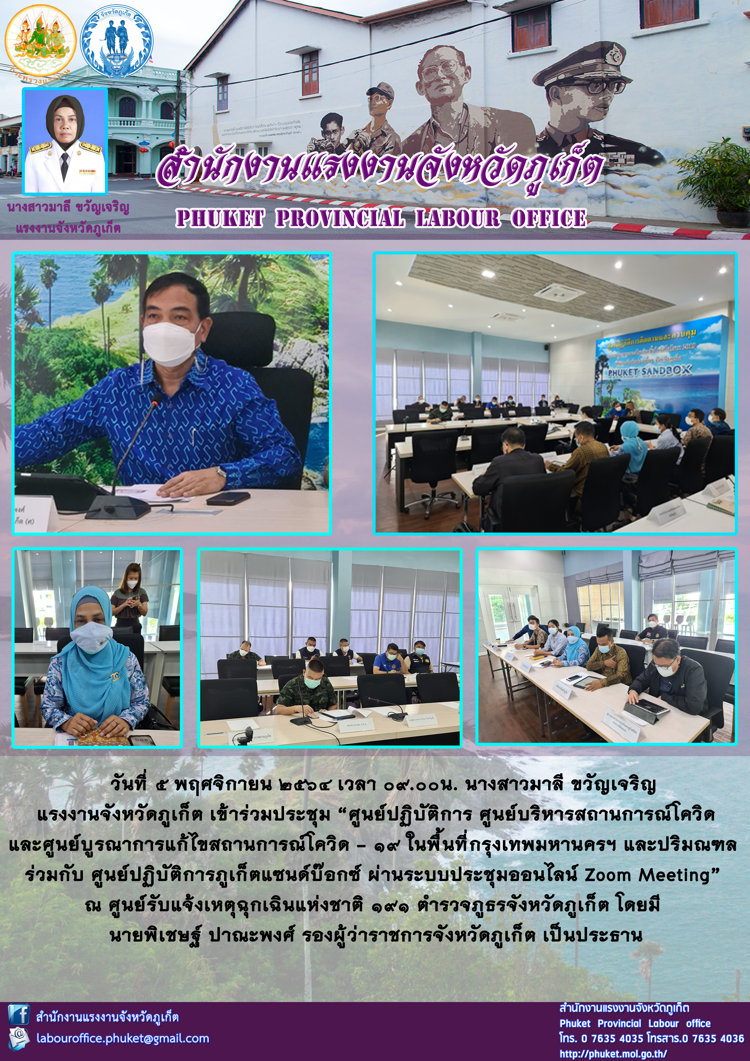 นางสาวมาลี ขวัญเจริญ แรงงานจังหวัดภูเก็ต เข้าร่วมประชุม “ศูนย์ปฏิบัติการ ศูนย์บริหารสถานการณ์โควิด และศูนย์บูรณาการแก้ไขสถานการณ์โควิด – 19 ในพื้นที่กรุงเทพมหานครฯ และปริมณฑล ร่วมกับ ศูนย์ปฏิบัติการภูเก็ตแซนด์บ๊อกซ์ ผ่านระบบประชุมออนไลน์ Zoom Meeting”
