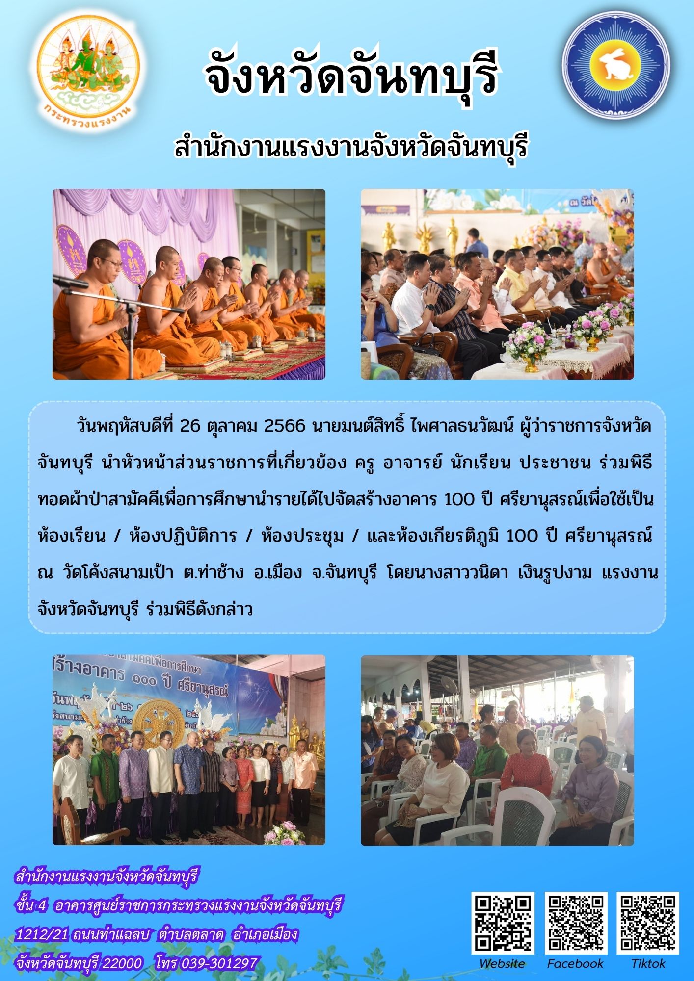 สรจ.จันทบุรี ร่วมพิธีทอดผ้าป่าสามัคคีเพื่อการศึกษานำรายได้ไปจัดสร้างอาคาร 100 ปี ศรียานุสรณ์เพื่อใช้เป็น ห้องเรียน / ห้องปฏิบัติการ / ห้องประชุม / และห้องเกียรติภูมิ 100 ปี ศรียานุสรณ์
