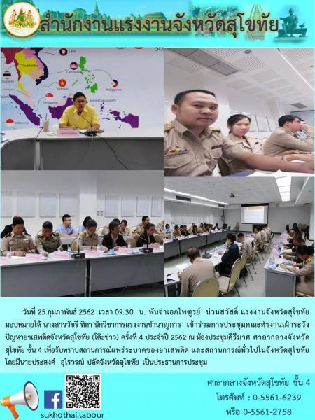 นางสาววัชรี ทิตา นักวิชาการแรงงานชำนาญการ ได้รับมอบหมายจากท่านแรงงานจังหวัด เข้าร่วมการประชุมคณะทำงานเฝ้าระวังปัญหายาเสพติดจังหวัดสุโขทัย (โต๊ะข่าว) ครั้งที่ 4 ประจำปี 2562