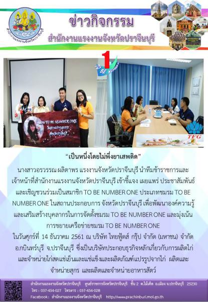 นางสาวอรวรรณ ผลิตาพร แรงงานจังหวัดปราจีนบุรี นำทีมข้าราชการและเจ้าหน้าที่สำนักงานแรงงานจังหวัดปราจีนบุรี เข้าชี้แจง เผยแพร่ ประชาสัมพันธ์ และเชิญชวนร่วมเป็นสมาชิก TO BE NUMBER ONE ประเภมรม TO BE NUMBER ONE ในสถานประกอบการ จังหวัดปราจีนบุรี เพื่อพัฒนาองค์ความรู้และเสริมสร้างบุคลากรในการจัดตั้งชมรม TO BE NUMBER ONE และมุ่งเน