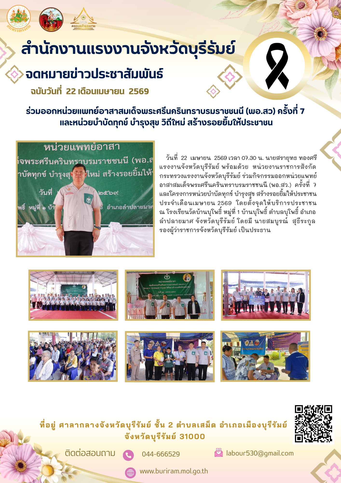 แรงงานจังหวัดบุรีรัมย์ ร่วมออกหน่วยแพทย์อาสาสมเด็จพระศรีนครินทราบรมราชชนนี (พอ.สว) ครั้งที่ 7 และหน่วยบำบัดทุกข์ บำรุงสุข วิถีใหม่ สร้างรอยยิ้มให้ประชาชน