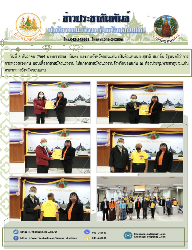 แรงงานจังหวัดขอนแก่น เป็นตัวแทนนายสุชาติ ชมกลิ่น รัฐมนตรีว่าการกระทรวงแรงงาน มอบเสื้ออาสาสมัครแรงงาน ให้แก่อาสาสมัครแรงงานจังหวัดขอนแก่น