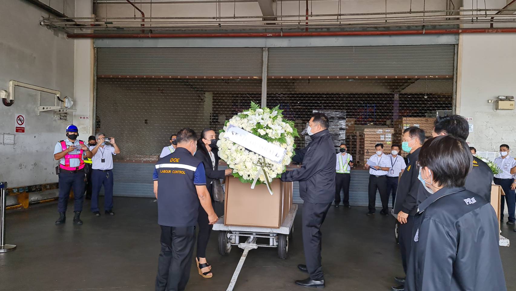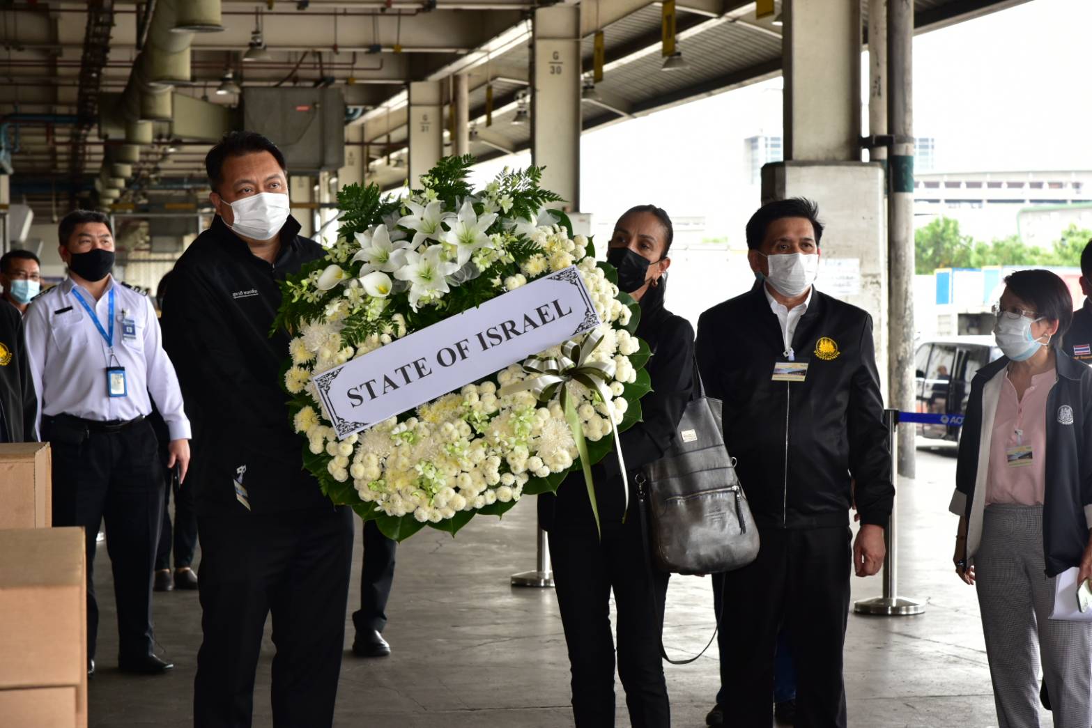 เมื่อวันที่ 26 พฤษภาคม 2564 นายสุชาติ ชมกลิ่น รัฐมนตรีว่าการกระทรวงแรงงาน เดินทางไปยังสนามบินสุวรรณภูมิ จังหวัดสมุทรปราการ เพื่อรับศพแรงงานไทยกรณีเสียชีวิตจากเหตุโจมตีทางอากาศโดยกลุ่มฮามาสในประเทศอิสราเอล โดยมี นายสุทธิ สุโกศล ปลัดกระทรวงแรงงาน นางเธียรรัตน์ นะวะมะวัฒน์ โฆษกกระทรวงแรงงาน นายไพโรจน์ โชติกเสถียร รองปลัดกระทรวงแรงงาน รักษาราชการแทนอธิบดีกรมการจัดหางาน Ms.ETTY MIZRACHI (เอ็ตตี มิชราคี) อัครราชทูต กงสุลประจำสถานเอกอัครราชทูตอิสราเอล พร้อมด้วยผู้บริหารระดับสูงกระทรวงแรงงาน เข้าร่วมในครั้งนี้ด้วย ซึ่งสถานเอกอัครราชทูต ณ กรุงเทลอาวีฟ ได้จัดพิธีไว้อาลัยและส่งศพนายวีรวัฒน์ การุญบริรักษ์ และนายสิขรินทร์ สงำรัมย์ แรงงานไทยจากนิคมเกษตร (โมชาฟ) โอฮาด 2 ราย ที่เสียชีวิตจากจรวดโจมตีเมื่อวันที่ 18 พฤษภาคมที่ผ่านมา ณ ท่าอากาศยานแบนกูเรียน ในโอกาสนี้ ผู้เข้าร่วมพิธีได้ยืนสงบนิ่งและจุดเทียนไว้อาลัยให้แก่ผู้เสียชีวิต ก่อนที่โลงศพของเสียชีวิตจะถูกลำเลียงไปยังเครื่องบินของสายการบิน EI AI เที่ยวบินที่ LY081 ซึ่งเป็นเที่ยวบินอำนวยความสะดวกนำคนไทยในอิสราเอลกลับประเทศไทยที่สถานเอกอัครราชทูตฯ จัดขึ้นและได้เดินทางออกจากท่าอากาศยานเบนกูเรียนเวลา 22.00 น. ของวันที่ 25 พ.ค.64 และมาถึงท่าอากาศยานสุวรรณภูมิในวันนี้ (26 พ.ค.64) เวลา 12.30 น.โดยศพของผู้เสียชีวิตทั้ง 2 รายจะถูกนำส่งถึงภูมิลำเนาที่จังหวัดเพชรบูรณ์และบุรีรัมย์ทันทีที่เดินทางถึงท่าอากาศยานสุวรรณภูมิ นอกจากนี้ นางสาวพรรณนภา จันทรารมย์ เอกอัครราชทูต ณ กรุงเทลอาวีฟ ยังได้ดำเนินการจัดให้แรงงานจากโมชาฟโอฮาดที่ได้รับผลกระทบจากการโจมตีด้วยจรวดเมื่อวันที่ 18 พฤษภาคมที่ผ่านมา จำนวน 18 ราย ซึ่งในจำนวนดังกล่าวรวมถึงผู้ได้รับบาดเจ็บจากเหตุการณ์ดังกล่าว 2 ราย ได้แก่ นายจักรี รัตพลทีและนายธนดล ขันธชัย เดินทางกลับประเทศไทยด้วยเที่ยวบินนี้ด้วย