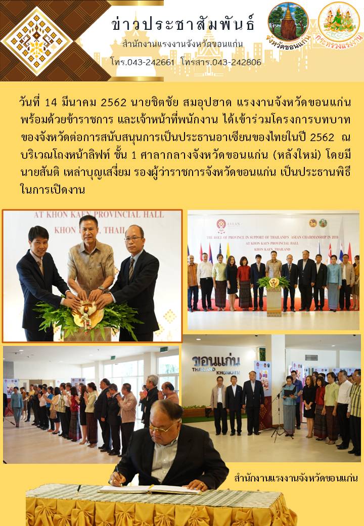 นายชิตชัย สมอุปฮาด แรงงานจังหวัดขอนแก่น พร้อมด้วยข้าราชการ และเจ้าหน้าที่พนักงาน ได้เข้าร่วมโครงการบทบาทของจังหวัดต่อการสนับสนุนการเป็นประธานอาเซียนของไทยในปี 2562