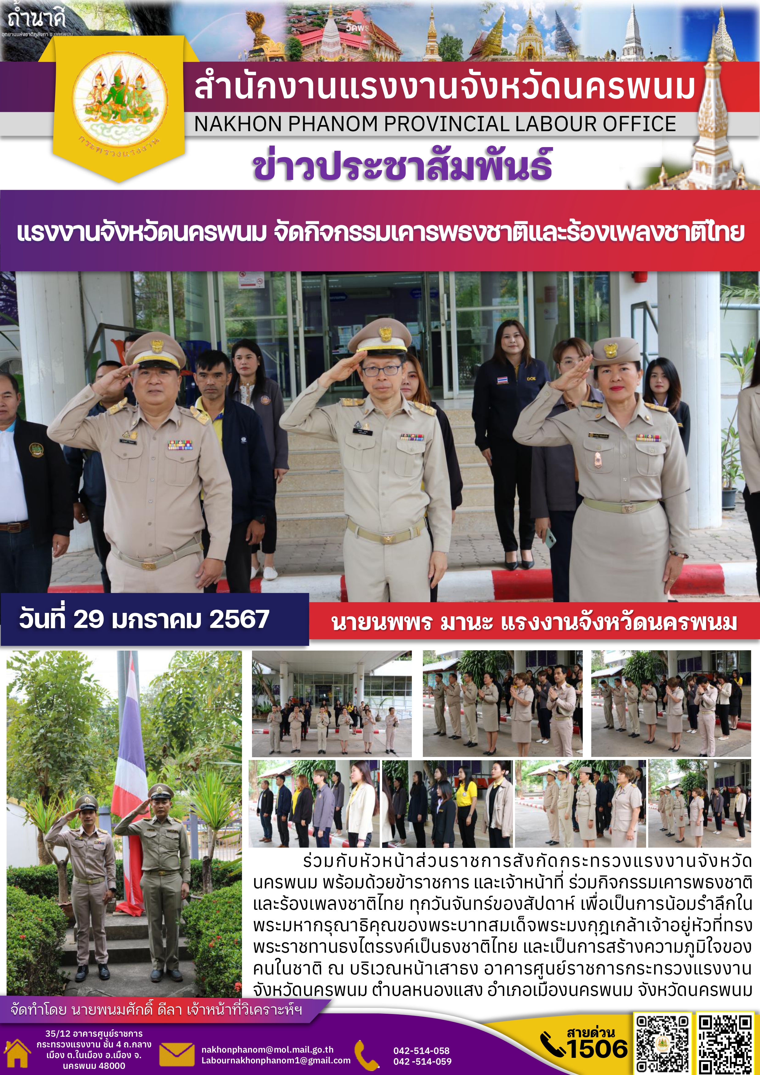 วันที่ 29 มกราคม 2567 นายนพพร มานะ แรงงานจังหวัดนครพนม ร่วมกับหัวหน้าส่วนราชการสังกัดกระทรวงแรงงานจังหวัดนครพนม พร้อมด้วยข้าราชการ และเจ้าหน้าที่ ร่วมกิจกรรมเคารพธงชาติและร้องเพลงชาติไทย ทุกวันจันทร์ของสัปดาห์ เพื่อเป็นการน้อมรำลึกในพระมหากรุณาธิคุณของพระบาทสมเด็จพระมงกุฎเกล้าเจ้าอยู่หัวที่ทรงพระราชทานธงไตรรงค์เป็นธงชาติไทย และเป็นการสร้างความภูมิใจของคนในชาติ ณ บริเวณหน้าเสาธง อาคารศูนย์ราชการกระทรวงแรงงานจังหวัดนครพนม ตำบลหนองแสง อำเภอเมืองนครพนม จังหวัดนครพนม