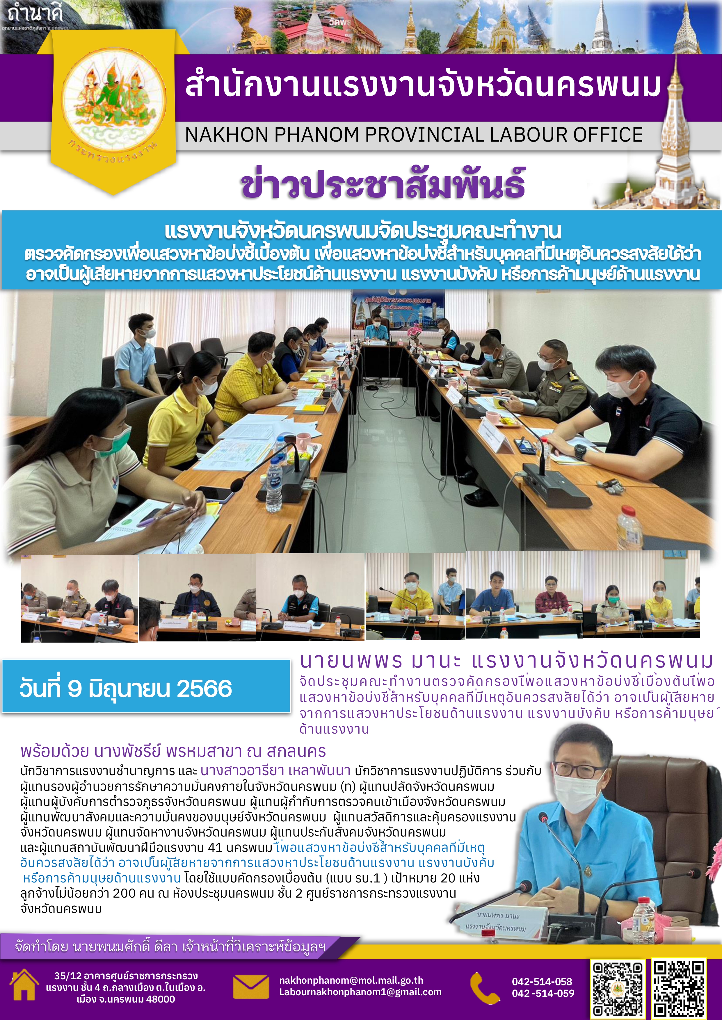 นายนพพร มานะ แรงงานจังหวัดนครพนม จัดประชุมคณะทำงานตรวจคัดกรองเพื่อแสวงหาข้อบ่งชี้เบื้องต้นเพื่อแสวงหาข้อบ่งชี้สำหรับบุคคลที่มีเหตุอันควรสงสัยได้ว่า อาจเป็นผู้เสียหายจากการแสวงหาประโยชน์ด้านแรงงาน แรงงานบังคับ หรือการค้ามนุษย์ด้านแรงงาน พร้อมด้วย นางพัชรีย์ พรหมสาขา ณ สกลนครนักวิชาการแรงงานชำนาญการ และ นางสาวอารียา เหลาพันนา นักวิชาการแรงงานปฏิบัติการ ร่วมกับผู้แทนรองผู้อำนวยการรักษาความมั่นคงภายในจังหวัดนครพนม (ท) ผู้แทนปลัดจังหวัดนครพนมผู้แทนผู้บังคับการตำรวจภูธรจังหวัดนครพนม ผู้แทนผู้กำกับการตรวจคนเข้าเมืองจังหวัดนครพนมผู้แทนพัฒนาสังคมและความมั่นคงของมนุษย์จังหวัดนครพนม ผู้แทนสวัสดิการและคุ้มครองแรงงานจังหวัดนครพนม ผู้แทนจัดหางานจังหวัดนครพนม ผู้แทนประกันสังคมจังหวัดนครพนมและผู้แทนสถาบันพัฒนาฝีมือแรงงาน 41 นครพนม เพื่อแสวงหาข้อบ่งชี้สำหรับบุคคลที่มีเหตุอันควรสงสัยได้ว่า อาจเป็นผู้เสียหายจากการแสวงหาประโยชน์ด้านแรงงาน แรงงานบังคับ หรือการค้ามนุษย์ด้านแรงงาน โดยใช้แบบคัดกรองเบื้องต้น (แบบ รบ.1 ) เป้าหมาย 20 แห่งลูกจ้างไม่น้อยกว่า 200 คน ณ ห้องประชุมนครพนม ชั้น 2 ศูนย์ราชการกระทรวงแรงงานจังหวัดนครพนม