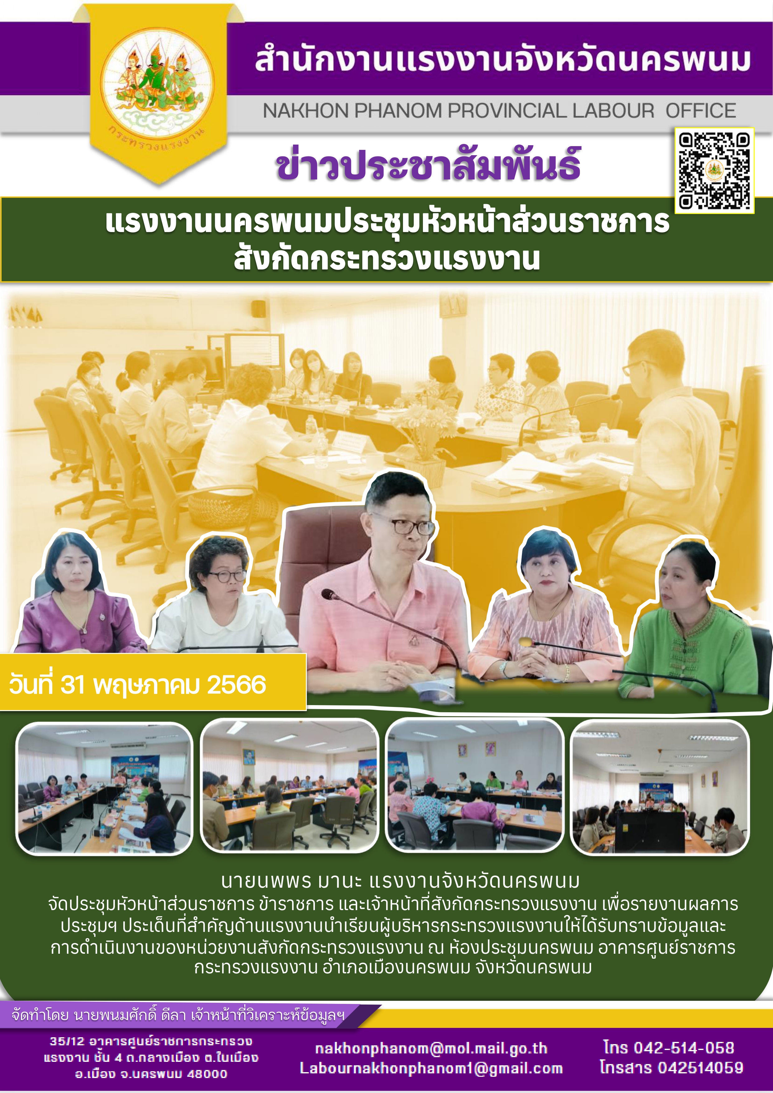 นายนพพร มานะ แรงงานจังหวัดนครพนม จัดประชุมหัวหน้าส่วนราชการ ข้าราชการ และเจ้าหน้าที่สังกัดกระทรวงแรงงาน เพื่อรายงานผลการประชุมฯ ประเด็นที่สำคัญด้านแรงงานนำเรียนผู้บริหารกระทรวงแรงงานให้ได้รับทราบข้อมูลและการดำเนินงานของหน่วยงานสังกัดกระทรวงแรงงาน ณ ห้องประชุมนครพนม อาคารศูนย์ราชการกระทรวงแรงงาน อำเภอเมืองนครพนม จังหวัดนครพนม