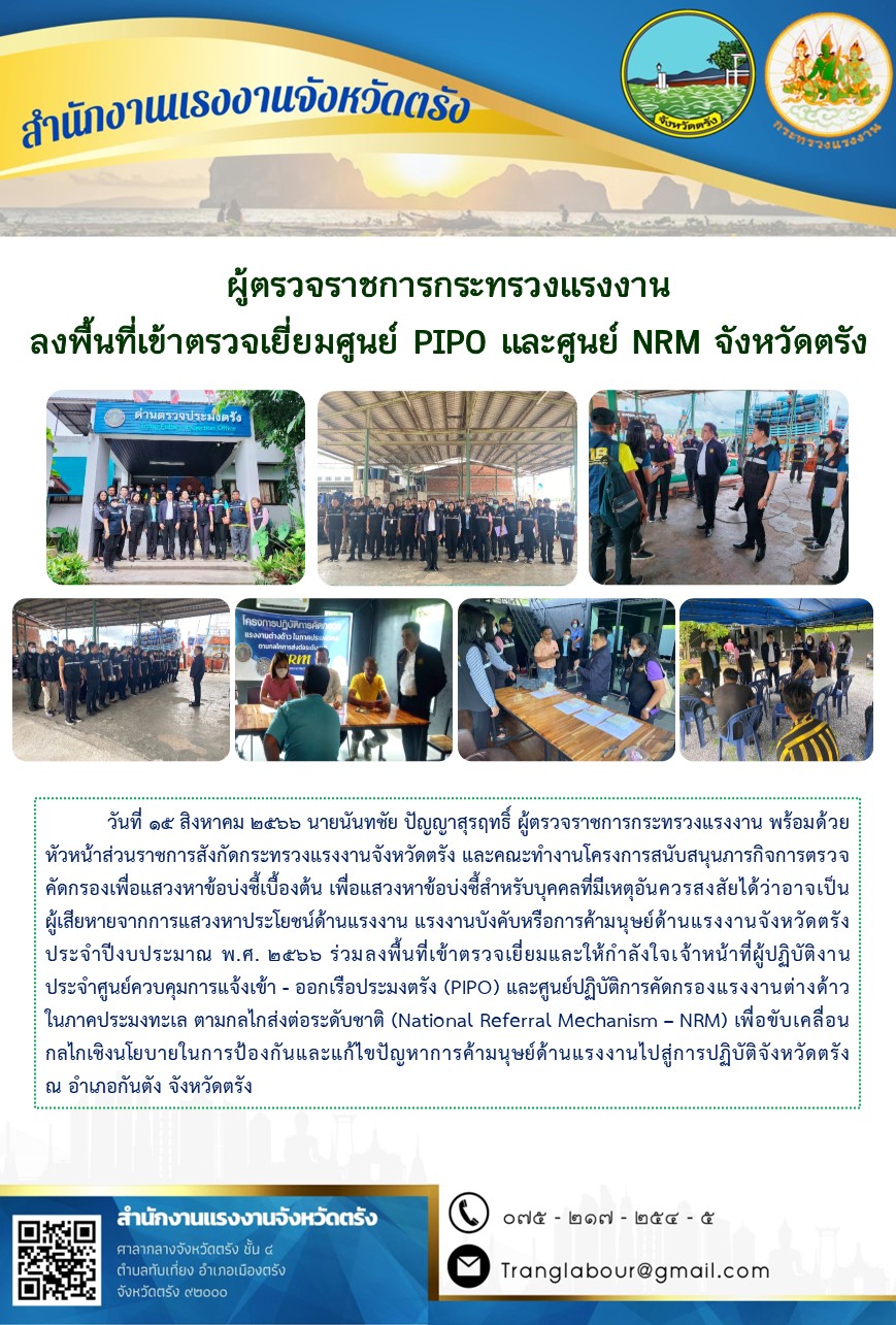ผู้ตรวจราชการกระทรวงแรงงาน พร้อมด้วยหัวหน้าส่วนราชการสังกัดกระทรวงแรงงานจังหวัดตรัง และคณะทำงาน ลงพื้นที่เข้าตรวจเยี่ยมศูนย์ PIPO และศูนย์ NRM จังหวัดตรัง