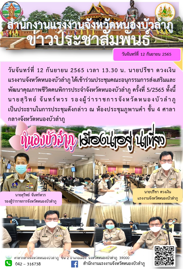 นายปรีชา ดวงเงิน แรงงานจังหวัดหนองบัวลำภู ได้เข้าร่วมประชุมคณะอนุกรรมการส่งเสริมและพัฒนาคุณภาพชีวิตคนพิการประจำจังหวัดหนองบัวลำภู ครั้งที่ 5/2565