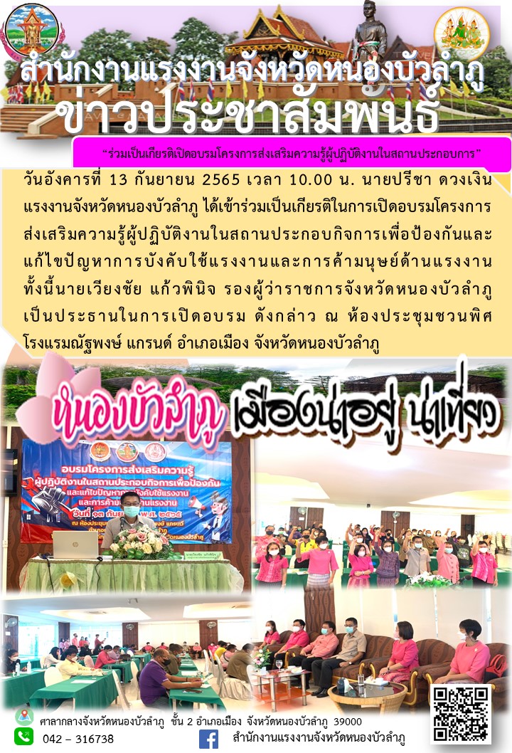 วันอังคารที่ 13 กันยายน 2565 เวลา 10.00 น. นายปรีชา ดวงเงิน แรงงานจังหวัดหนองบัวลำภู ได้เข้าร่วมเป็นเกียรติในการเปิดอบรมโครงการส่งเสริมความรู้ผู้ปฏิบัติงานในสถานประกอบกิจการเพื่อป้องกันและแก้ไขปัญหาการบังคับใช้แรงงานและการค้ามนุษย์ด้านแรงงาน ทั้งนี้นายเวียงชัย แก้วพินิจ รองผู้ว่าราชการจังหวัดหนองบัวลำภู เป็นประธานในการเปิดอบรม ดังกล่าว ณ ห้องประชุมชวนพิศ โรงแรมณัฐพงษ์ แกรนด์ อำเภอเมือง จังหวัดหนองบัวลำภู