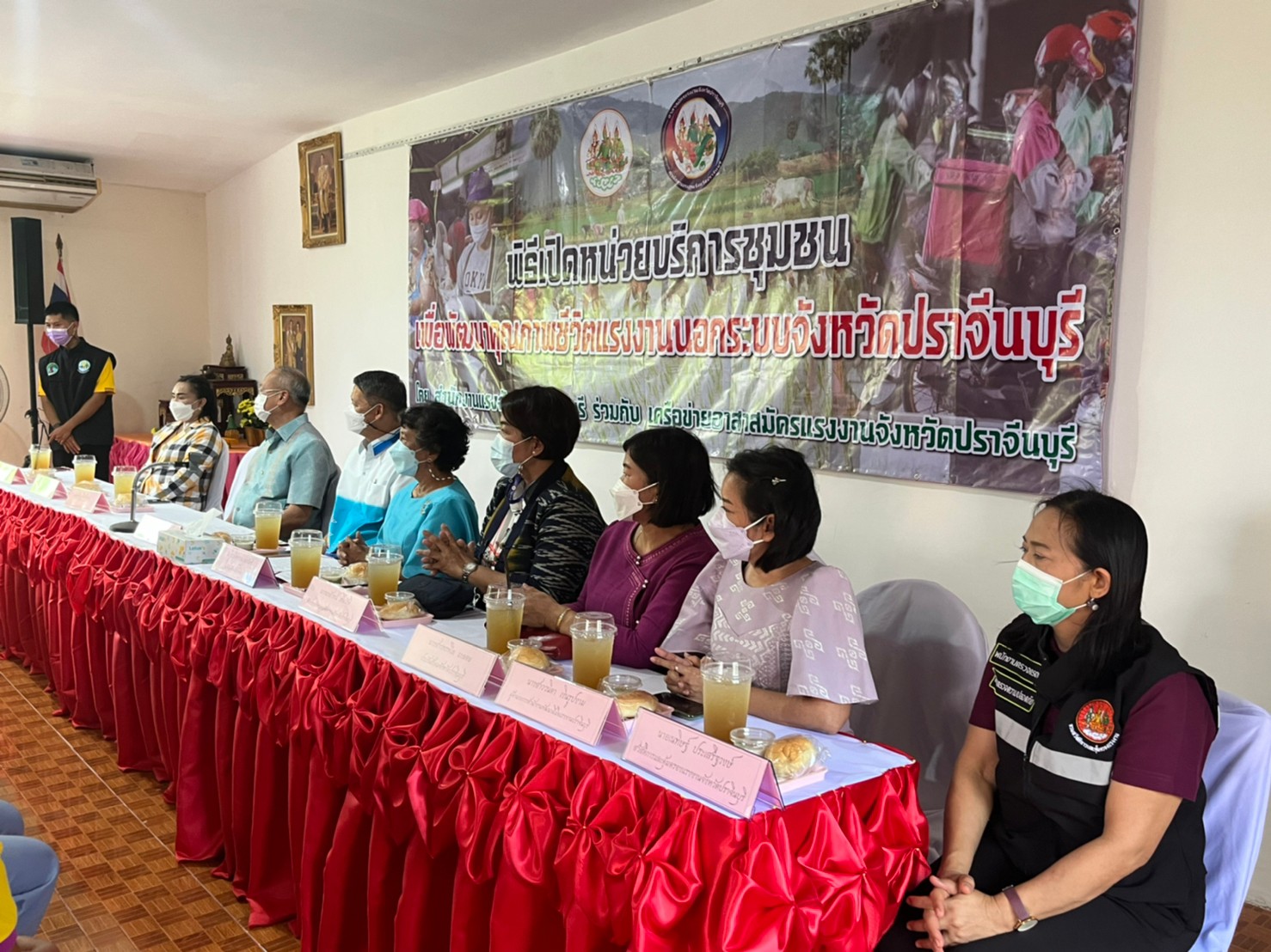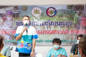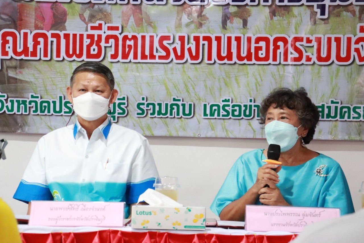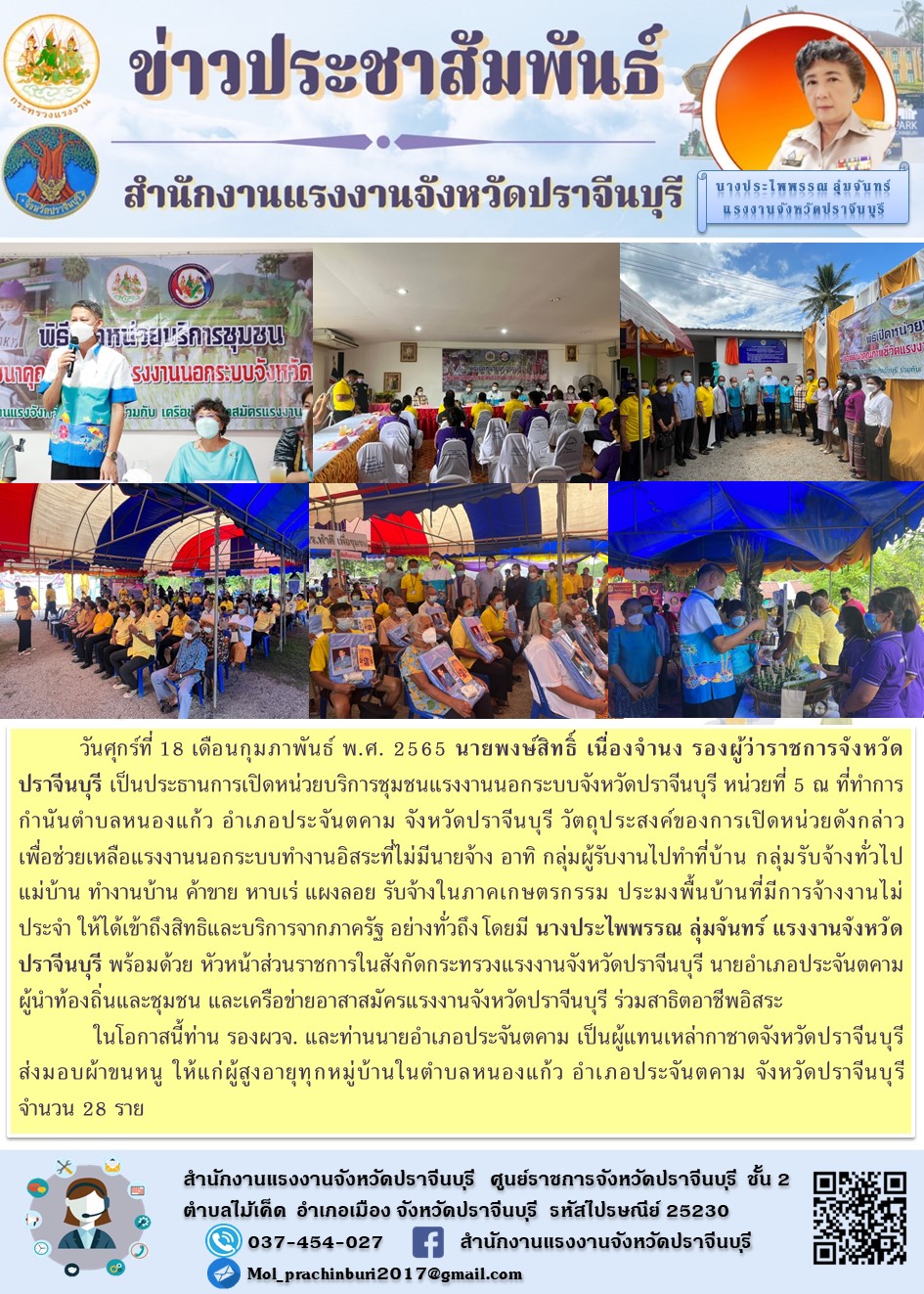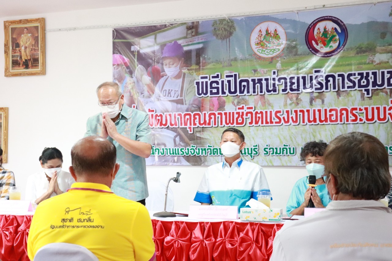 วันศุกร์ที่ 18 เดือนกุมภาพันธ์ พ.ศ. 2565 นายพงษ์สิทธิ์ เนื่องจำนง รองผู้ว่าราชการจังหวัดปราจีนบุรี เป็นประธานการเปิดหน่วยบริการชุมชนแรงงานนอกระบบจังหวัดปราจีนบุรี หน่วยที่ 5 ณ ที่ทำการกำนันตำบลหนองแก้ว อำเภอประจันตคาม จังหวัดปราจีนบุรี วัตถุประสงค์ของการเปิดหน่วยดังกล่าว เพื่อช่วยเหลือแรงงานนอกระบบทำงานอิสระที่ไม่มีนายจ้าง อาทิ กลุ่มผู้รับงานไปทำที่บ้าน กลุ่มรับจ้างทั่วไป แม่บ้าน ทำงานบ้าน ค้าขาย หาบเร่ แผงลอย รับจ้างในภาคเกษตรกรรม ประมงพื้นบ้านที่มีการจ้างงานไม่ประจำ ให้ได้เข้าถึงสิทธิและบริการจากภาครัฐ อย่างทั่วถึง โดยมี นางประไพพรรณ ลุ่มจันทร์ แรงงานจังหวัดปราจีนบุรี พร้อมด้วย หัวหน้าส่วนราชการในสังกัดกระทรวงแรงงานจังหวัดปราจีนบุรี นายอำเภอประจันตคาม ผู้นำท้องถิ่นและชุมชน และเครือข่ายอาสาสมัครแรงงานจังหวัดปราจีนบุรี ร่วมสาธิตอาชีพอิสระ ในโอกาสนี้ท่าน รองผวจ. และท่านนายอำเภอประจันตคาม เป็นผู้แทนเหล่ากาชาดจังหวัดปราจีนบุรี ส่งมอบผ้าขนหนู ให้แก่ผู้สูงอายุทุกหมู่บ้านในตำบลหนองแก้ว อำเภอประจันตคาม จังหวัดปราจีนบุรี จำนวน 28 ราย