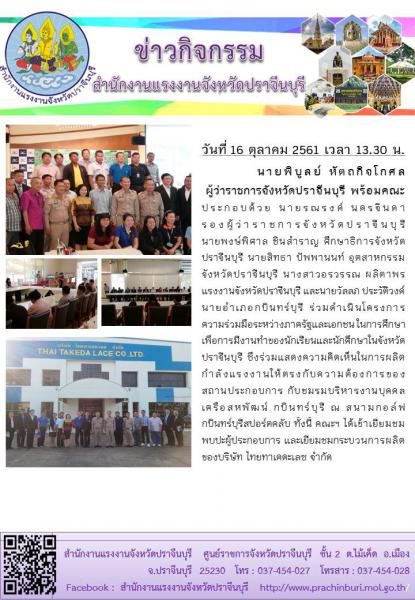 นายพิบูลย์ หัตถกิจโกศล ผู้ว่าราชการจังหวัดปราจีนบุรี พร้อมคณะ ร่วมดำเนินโครงการความร่วมมือระหว่างภาครัฐและเอกชน ในการศึกษาเพื่อการมีงานทำของนักเรียนและนักศึกษาในจังหวัดปราจีนบุรี