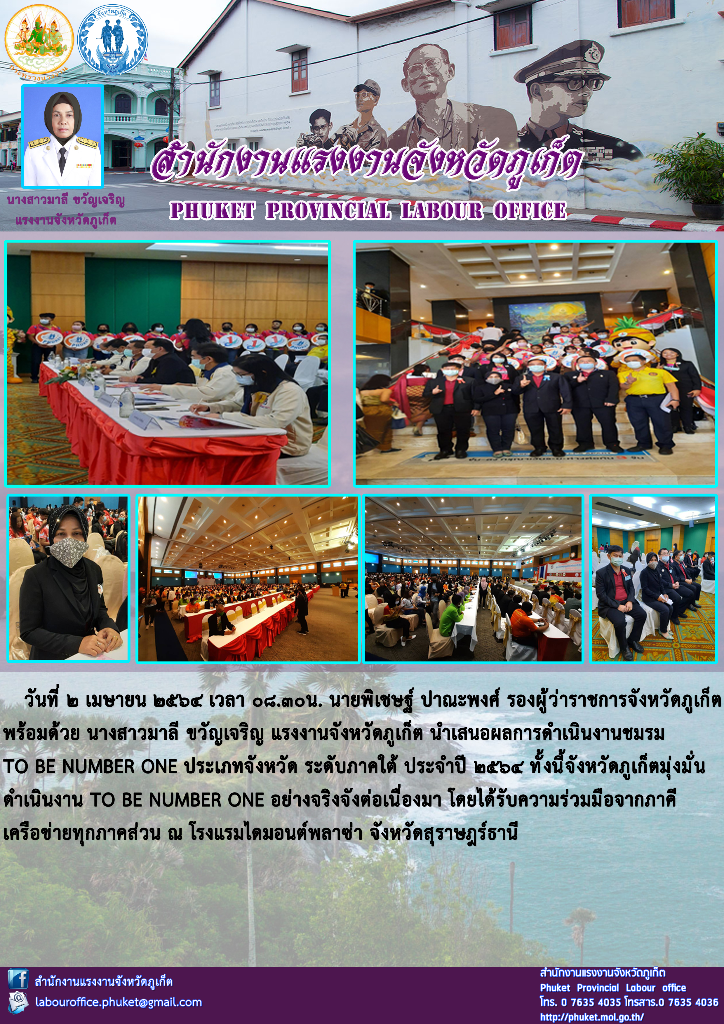 นายพิเชษฐ์ ปาณะพงศ์ รองผู้ว่าราชการจังหวัดภูเก็ต พร้อมด้วย นางสาวมาลี ขวัญเจริญ แรงงานจังหวัดภูเก็ต นำเสนอผลการดำเนินงานชมรม TO BE NUMBER ONE ประเภทจังหวัด ระดับภาคใต้ ประจำปี 2564