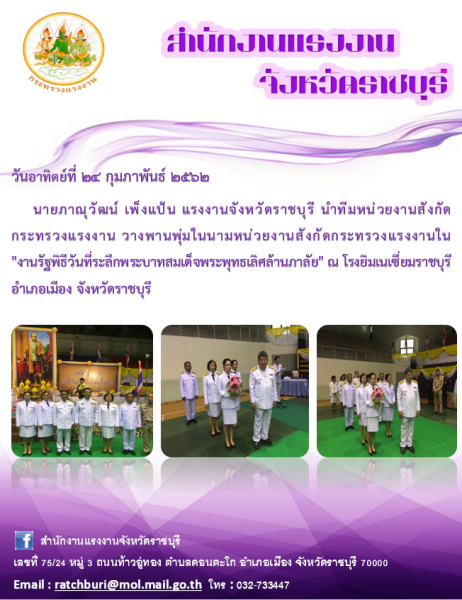 นายภาณุวัฒน์ เพ็งแป้น แรงงานจังหวัดราชบุรี และข้าราชการแรงงานจังหวัด ร่วมงานรัฐพิธีวันที่ระลึกพระบาทสมเด็จพระพุทธเลิศล้านภาลัย ณ โรงยิมเซี่ยมราชบุรี