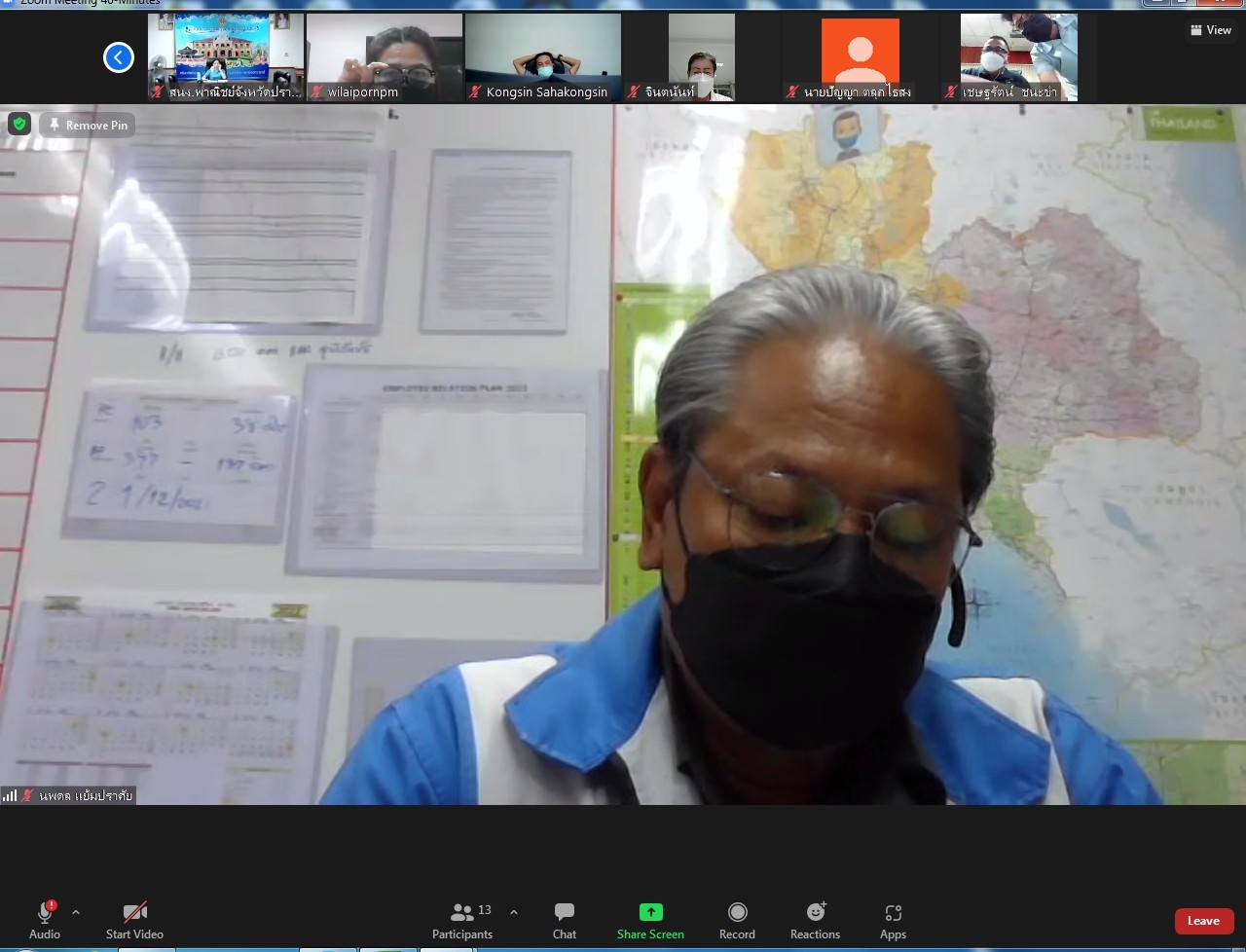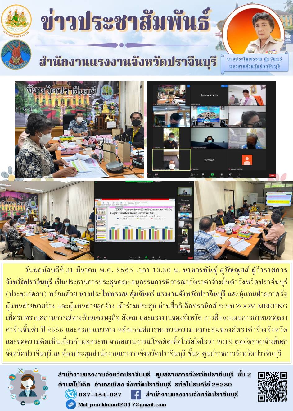 วันพฤหัสบดีที่ 31 มีนาคม พ.ศ. 2565 เวลา 13.30 น. นายวรพันธุ์ สุวัณณุสส์ ผู้ว่าราชการจังหวัดปราจีนบุรี เป็นประธานการประชุมคณะอนุกรรมการพิจารณาอัตราค่าจ้างขั้นต่ำจังหวัดปราจีนบุรี (ประชุมย่อยฯ) พร้อมด้วย นางประไพพรรณ ลุ่มจันทร์ แรงงานจังหวัดปราจีนบุรี และผู้แทนฝ่ายภาครัฐ ผู้แทนฝ่ายนายจ้าง และผู้แทนฝ่ายลูกจ้าง เข้าร่วมประชุม ผ่านสื่ออิเล็กทรอนิกส์ ระบบ ZOOM MEETING เพื่อรับทราบสถานการณ์ทางด้านเศรษฐกิจ สังคม และแรงงานของจังหวัด การชี้แจงแผนการกำหนดอัตราค่าจ้างขั้นต่ำ ปี 2565 และกรอบแนวทาง หลักเกณฑ์การทบทวนความเหมาะสมของอัตราค่าจ้างจังหวัด และขอความคิดเห็นเกี่ยวกับผลกระทบจากสถานการณ์โรคติดเชื้อไวรัสโคโรนา 2019 ต่ออัตราค่าจ้างขั้นต่ำจังหวัดปราจีนบุรี ณ ห้องประชุมสำนักงานแรงงานจังหวัดปราจีนบุรี ชั้น2 ศูนย์ราชการจังหวัดปราจีนบุรี