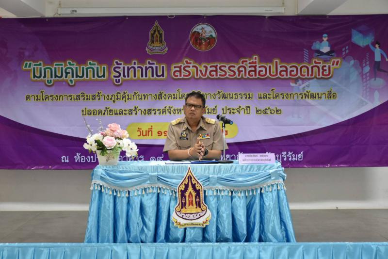 วันที่ ๑๑ มีนาคม ๒๕๖๒ เวลา ๐๘.๐๐ – ๑๖.๐๐ น. นางมาลัยอร หิรัณยรัชต์ แรงงานจังหวัดบุรีรัมย์ มอบหมายให้ นายวรรณพ สุทารัมย์ นักวิชาการแรงงานชำนาญการ ร่วมเปิดโครงการเสริมสร้างภูมิคุ้มกันทางสังคมโดยมิติทางวัฒนธรรม และโครงการพัฒนาสื่อปลอดภัยและสร้างสรรค์จังหวัดบุรีรัมย์ ณ ห้องประชุมอาคาร ๑๙ ชั้น ๒ มหาวิทยาลัยราชภัฏบุรีรัมย์