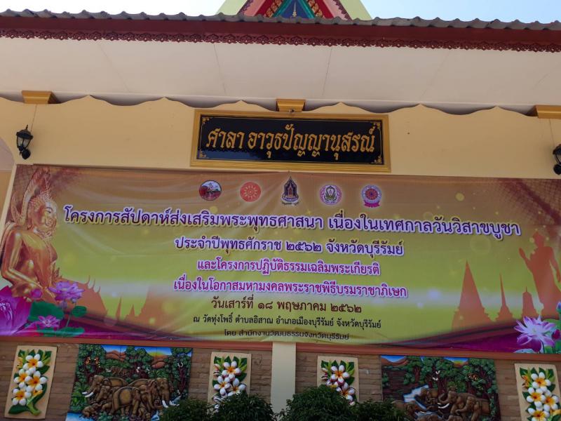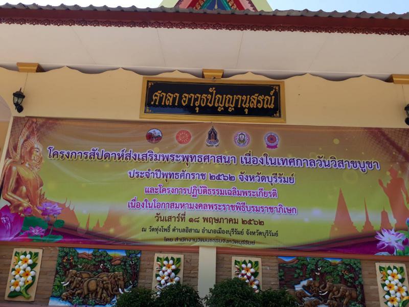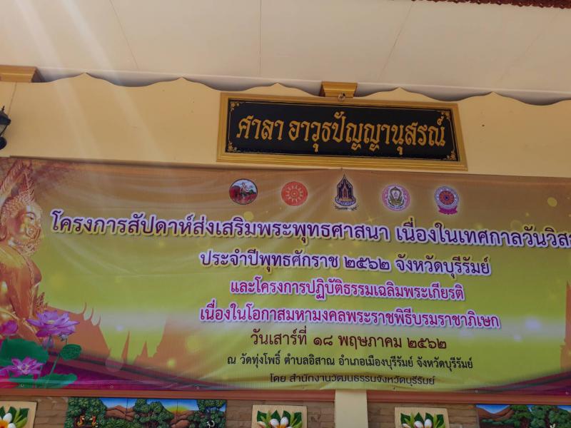 วันที่ ๒๑ พฤษภาคม ๒๕๖๒ เวลา ๐๙.๓๐ น. นางมาลัยอร หิรัณยรัชต์ แรงงานจังหวัดบุรีรัมย์ มอบหมายให้ นายวรรณพ สุทารัมย์ นักวิชาการแรงงานชำนาญการ ร่วมโครงการปฏิบัติธรรมเฉลิมพระเกียรติ เนื่องในโอกาสมหามงคลพระราชพิธีบรมราชาภิเษกภายใต้โครงการกิจกรรมประชารัฐร่วมพัฒนาส่งเสริมคุณธรรมจริยธรรม ประจำปีงบประมาณ พ.ศ.๒๕๖๒