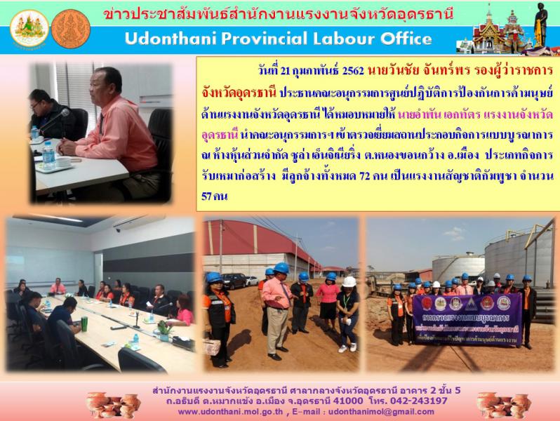 นายวันชัย จันทร์พร รองผู้ว่าราชการจังหวัดอุดรธานี มอบหมาย นายอำพัน เอกทัตร แรงงานจังหวัดอุดรธานี เข้าตรวจเยี่ยมสถานประกอบกิจการแบบบูรณาการ ณ ห้างหุ้นส่วนจำกัด ซูล่า เอ็นจิเนียริ่ง ต.หนองขอนกว้าง อ.เมือง จ.อุดรธานี