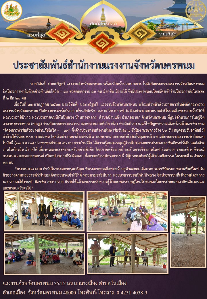 สำนักงานแรงงานจังหวัดนครพนม ปิดโครงการฟาร์มตัวอย่างต้านภัยโควิด – 19 ช่วยคนตกงาน ซึ่งมีประชาชนสนใจสมัครเข้าร่วมโครงการต่อในระยะที่ 2 อีก 20 คน