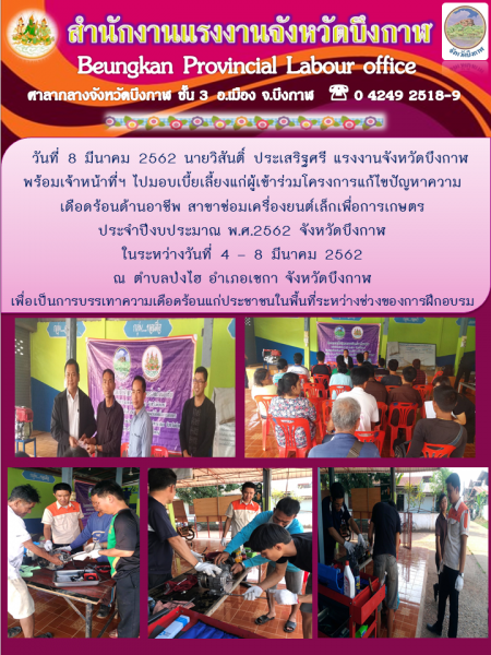 นายวิสันติ์ ประเสริฐศรี แรงงานจังหวัดบึงกาฬ จ่ายเบี้ยฝึกอบรมโครงการแก้ไขปัญหาความเดือดร้อนด้านอาชีพ ปี 2562 สาขาซ่อมเครื่องยนต์เล็กเพื่อการเกษตร
