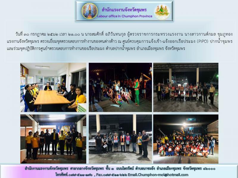 นายสมศักดิ์ อภิวันทนกุล ผู้ตรวจราชการกระทรวงแรงงาน นางสาวกานต์กมล ชุมภูทอง แรงงานจังหวัดชุมพร ตรวจเยี่ยมชุดตรวจสอบการทำงานของคนต่างด้าว ณ ศูนย์ควบคุมการแจ้งเข้า-แจ้งออกเรือประมง (PIPO) ปากน้ำชุมพรและร่วมชุดปฏิบัติการศูนย์ฯตรวจสอบการทำงานเรือประมง
