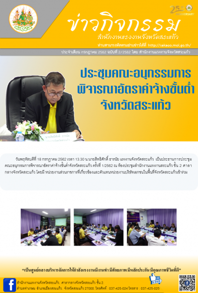 นายสิทธิศักดิ์ ธารนัย แรงงานจังหวัดสระแก้ว เป็นประธานการประชุมคณะอนุกรรมการพิจารณาอัตราค่าจ้างขั้นต่ำจังหวัดสระแก้ว ครั้งที่ 1/2562 ณ ห้องประชุมสำนักงานแรงงานสระแก้ว ชั้น 2 ศาลากลางจังหวัดสระแก้ว โดยมี หน่วยงานส่ว