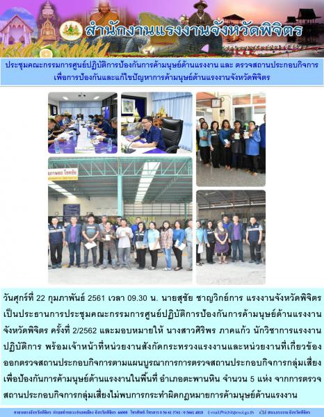 นายสุชัย ชาญวิกย์กร แรงงานจังหวัดพิจิตร เป็นประธานการประชุมคณะกรรมการศูนย์ปฏิบัติการป้องกันการค้ามนุษย์ด้านแรงงาน และ ตรวจสถานประกอบกิจการ เพื่อการป้องกันและแก้ไขปัญหาการค้ามนุษย์ด้านแรงงานจังหวัดพิจิตร