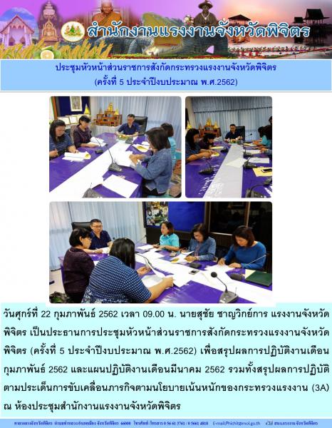 นายสุชัย ชาญวิกย์การ แรงงานจังหวัดพิจิตร เข้าร่วมประชุมหัวหน้าส่วนราชการสังกัดกระทรวงแรงงานจังหวัดพิจิตร (ครั้งที่ 5 ประจำปีงบประมาณ พ.ศ.2562)