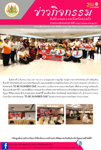 วันอังคารที่ 5 มีนาคม 2562 เวลา 08.00 น.นายอุดมเขต ราษฎร์นุ้ย รองผู้ว่าราชการจังหวัดสระแก้ว พร้อมด้วยศึกษาธิการจังหวัดสระแก้ว แรงงานจังหวัดสระแก้ว รองนายแพทย์สาธารณสุขจังหวัดสระแก้ว ร่วมนำเสนอผลการดำเนินงานจังหวัด/ชมรม TO BE NUMBER ONE ประเภทต่าง ๆ ระดับภาคกลางและภาคตะวันออก เพื่อรักษามาตรฐานพร้อมเป็นต้นแบบระดับเพชร ปีที่ 1 และร่วมพิธีประกาศผลและรับรางวัลพระราชทานหน้าพระฉายาลักษณ์ทูลกระหม่อมหญิงอุบลรัตนราชกัญญา สิริวัฒนาพรรณวดี ณ โรงแรมแอมบาสเดอร์ ซิตี้ จอมเทียน พัทยา จังหวัดชลบุรี