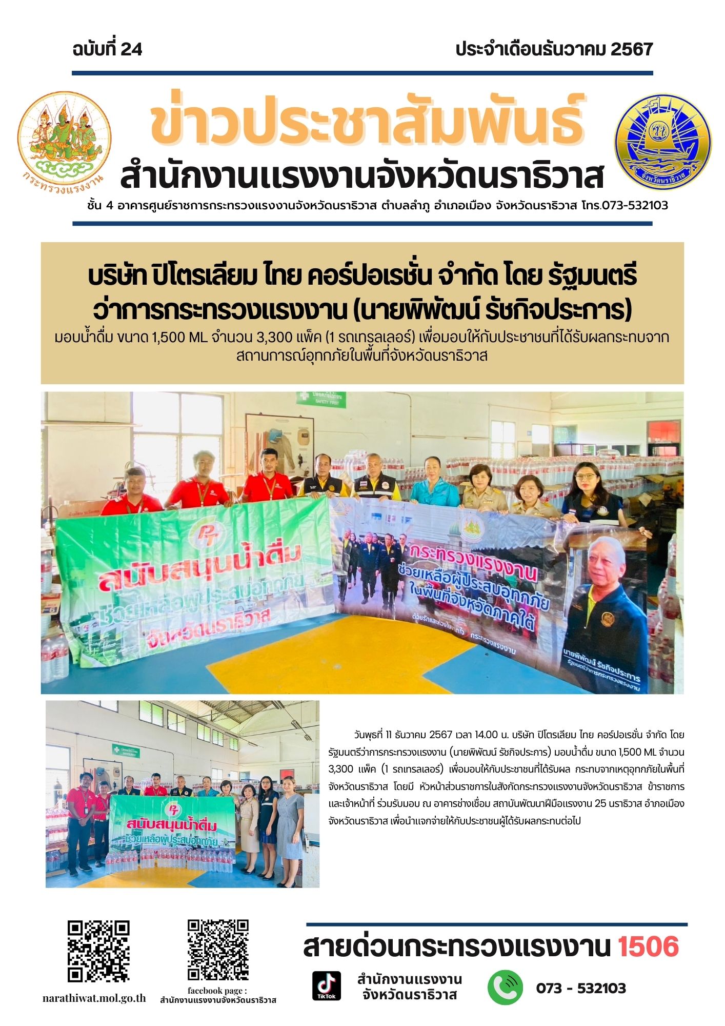 วันพุธที่ 11 ธันวาคม 2567 เวลา 14.00 น. บริษัท ปิโตรเลียม ไทย คอร์ปอเรชั่น จำกัด โดย รัฐมนตรีว่าการกระทรวงแรงงาน (นายพิพัฒน์ รัชกิจประการ) มอบน้ำดื่ม ขนาด 1,500 ML จำนวน 3,300 แพ็ค (1 รถเทรลเลอร์) เพื่อมอบให้กับประชาชนที่ได้รับผล กระทบจากเหตุอุทกภัยในพื้นที่จังหวัดนราธิวาส โดยมี หัวหน้าส่วนราชการในสังกัดกระทรวงแรงงานจังหวัดนราธิวาส ข้าราชการ และเจ้าหน้าที่ ร่วมรับมอบ ณ อาคารช่างเชื่อม สถาบันพัฒนาฝีมือแรงงาน 25 นราธิวาส อำภอเมือง จังหวัดนราธิวาส เพื่อนำแจกจ่ายให้กับประชาชนผู้ได้รับผลกระทบต่อไป