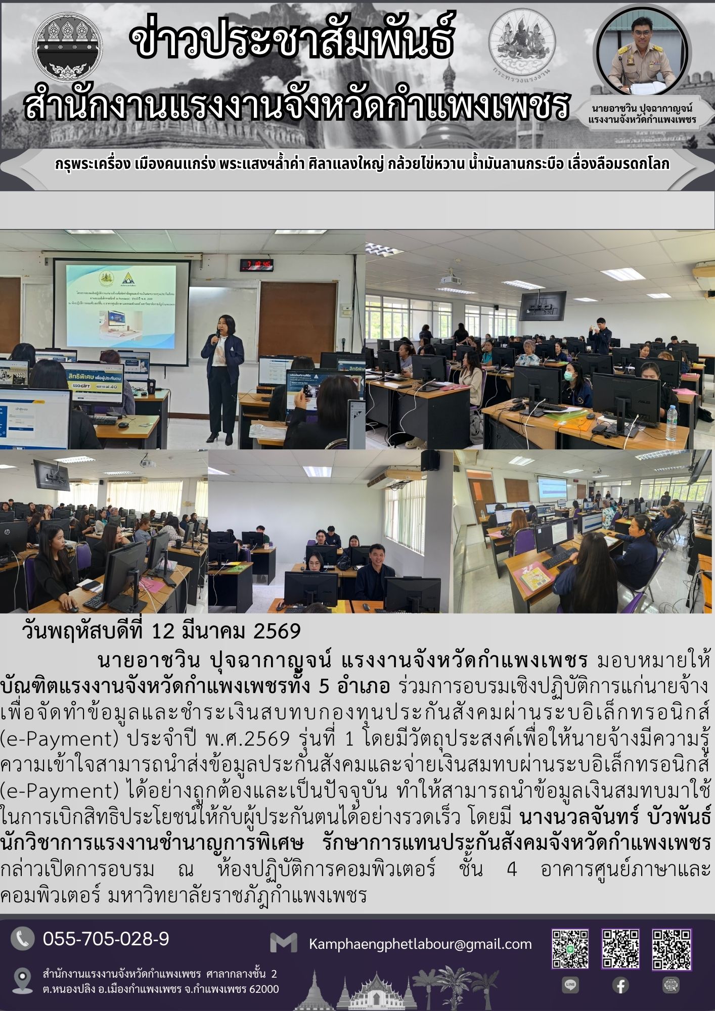 บัณฑิตแรงงานจังหวัดกำแพงเพชร ร่วมการอบรมเชิงปฏิบัติการแก่นายจ้าง เพื่อจัดทำข้อมูลและชำระเงินสบทบกองทุนประกันสังคมผ่านระบบอิเล็กทรอนิกส์ (E-Payment) ประจำปี พ.ศ.2569 รุ่นที่ 1