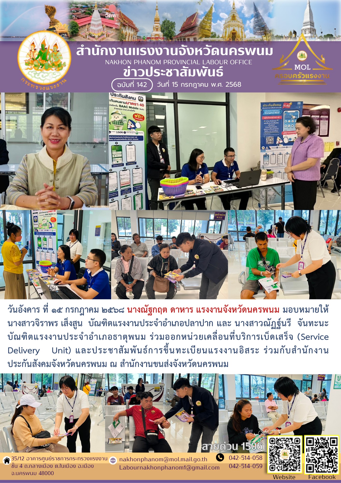 บัณฑิตแรงงานจังหวัดนครพนม ร่วมออกหน่วยเคลื่อนที่บริการเบ็ดเสร็จ (Service Delivery Unit) และประชาสัมพันธ์การขึ้นทะเบียนแรงงานอิสระ ร่วมกับสำนักงานประกันสังคมจังหวัดนครพนม