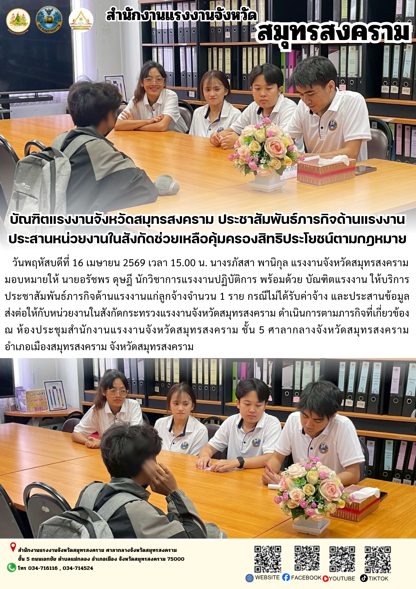 วันพฤหัสบดีที่ 16 เมษายน 2569 เวลา 15.00 น. นางรภัสสา พานิกุล แรงงานจังหวัดสมุทรสงคราม มอบหมายให้ นายอรัชพร ดุษฎี นักวิชาการแรงงานปฏิบัติการ พร้อมด้วย บัณฑิตแรงงาน ให้บริการประชาสัมพันธ์ภารกิจด้านแรงงานแก่ลูกจ้างจำนวน 1 ราย กรณีไม่ได้รับค่าจ้าง และประสานข้อมูลส่งต่อให้กับหน่วยงานในสังกัดกระทรวงแรงงานจังหวัดสมุทรสงคราม ดำเนินการตามภารกิจที่เกี่ยวข้อง ณ ห้องประชุมสำนักงานแรงงานจังหวัดสมุทรสงคราม ชั้น 5 ศาลากลางจังหวัดสมุทรสงคราม อำเภอเมืองสมุทรสงคราม จังหวัดสมุทรสงคราม