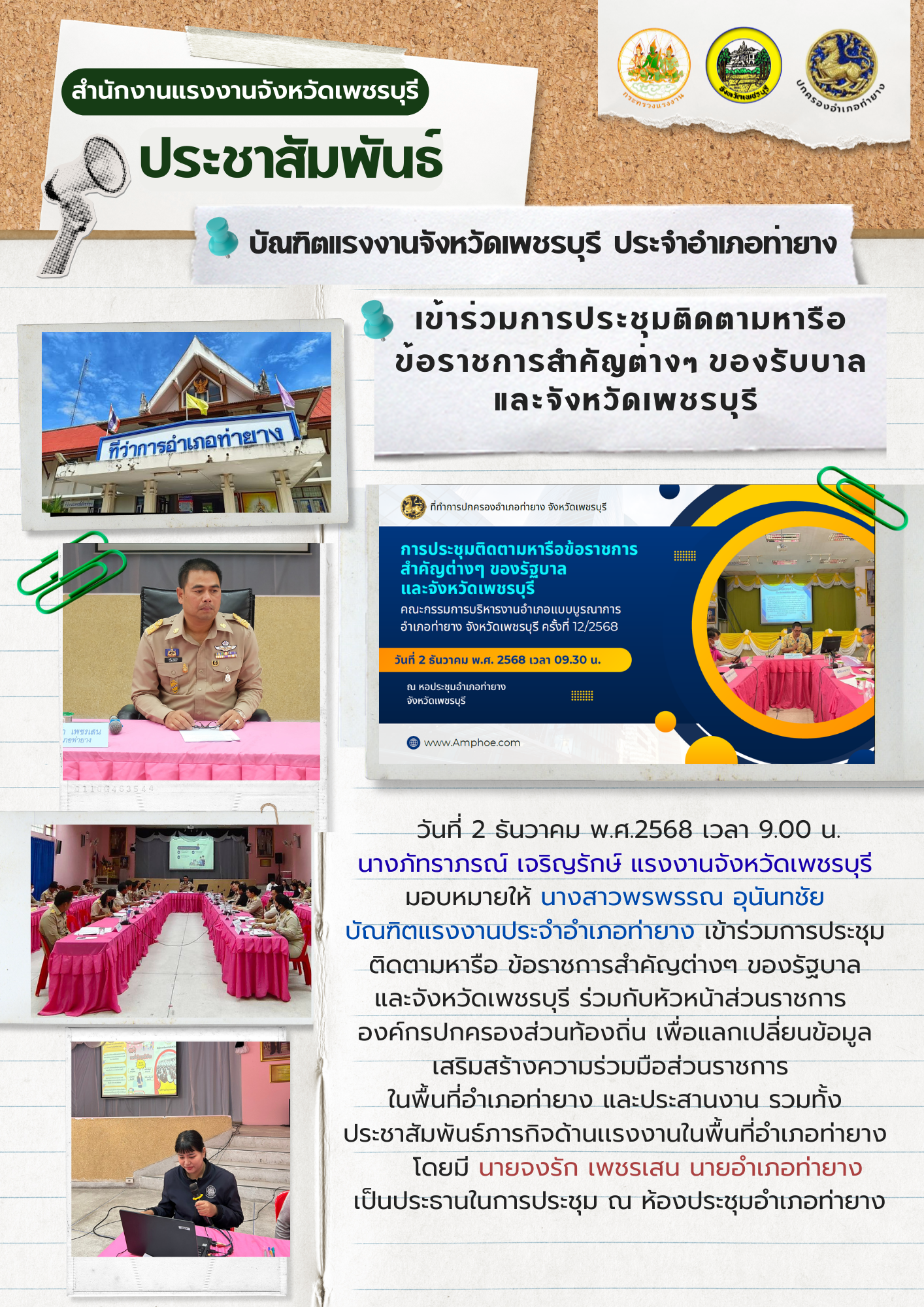 วันที่ 2 ธันวาคม พ.ศ.2568 เวลา 9.00 น. นางภัทราภรณ์ เจริญรักษ์ แรงงานจังหวัดเพชรบุรี มอบหมายให้ นางสาวพรพรรณ อุนันทชัย บัณฑิตแรงงานประจำอำเภอท่ายาง เข้าร่วมการประชุมติดตามหารือ ข้อราชการสำคัญต่างๆ ของรัฐบาล และจังหวัดเพชรบุรี ร่วมกับหัวหน้าส่วนราชการ องค์กรปกครองส่วนท้องถิ่น เพื่อแลกเปลี่ยนข้อมูลเสริมสร้างความร่วมมือส่วนราชการ ในพื้นที่อำเภอท่ายาง และประสานงาน รวมทั้งประชาสัมพันธ์ภารกิจด้านเเรงงานในพื้นที่อำเภอท่ายาง โดยมี นายจงรัก เพชรเสน นายอำเภอท่ายาง เป็นประธานในการประชุม ณ ห้องประชุมอำเภอท่ายาง