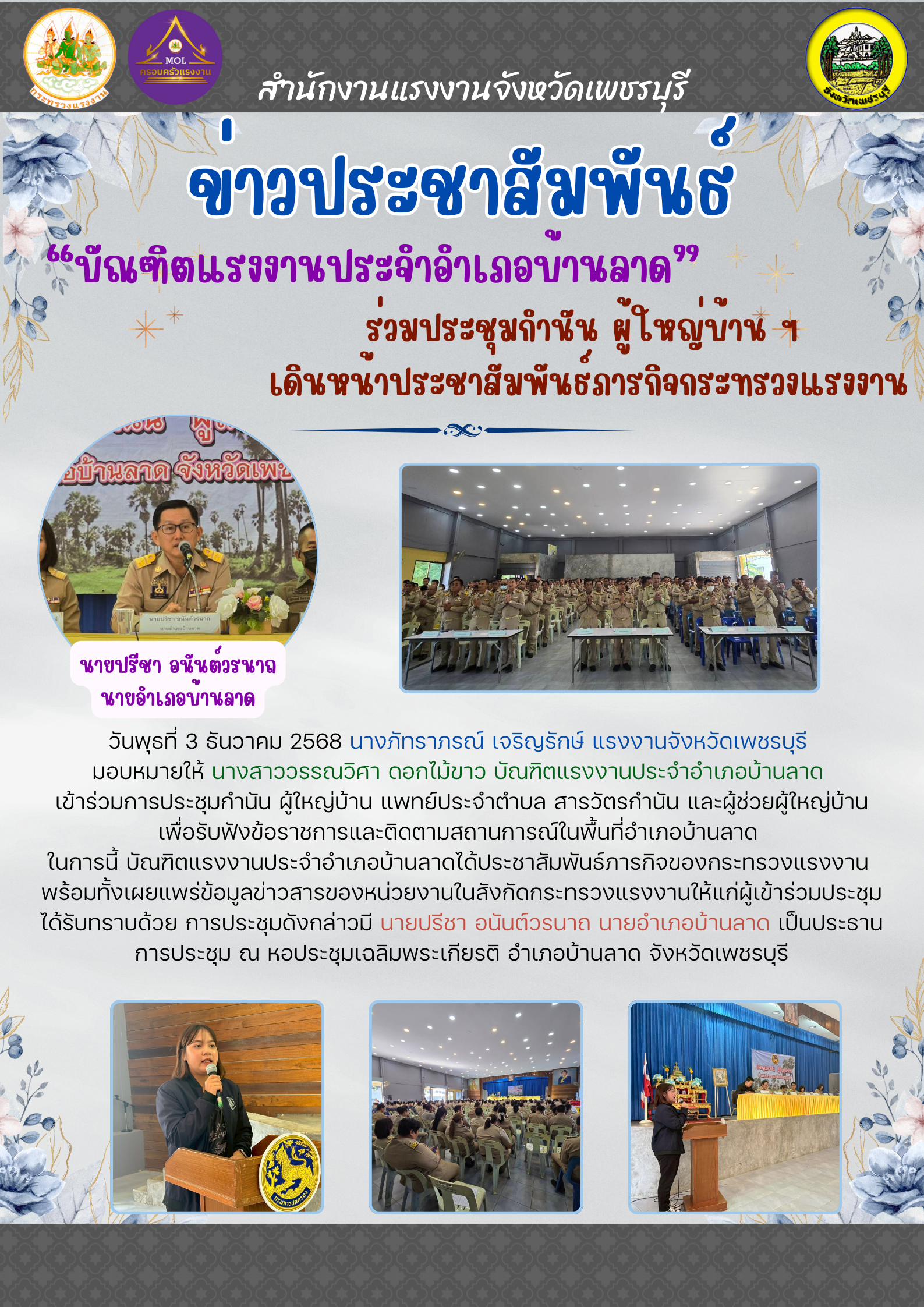 ในการนี้ บัณฑิตแรงงานประจำอำเภอบ้านลาดได้ประชาสัมพันธ์ภารกิจของกระทรวงแรงงาน พร้อมทั้งเผยแพร่ข้อมูลข่าวสารของหน่วยงานในสังกัดกระทรวงแรงงานให้แก่ผู้เข้าร่วมประชุมได้รับทราบด้วย การประชุมดังกล่าวมี นายปรีชา อนันต์วรนาถ นายอำเภอบ้านลาด เป็นประธานการประชุม ณ หอประชุมเฉลิมพระเกียรติ อำเภอบ้านลาด จังหวัดเพชรบุรี