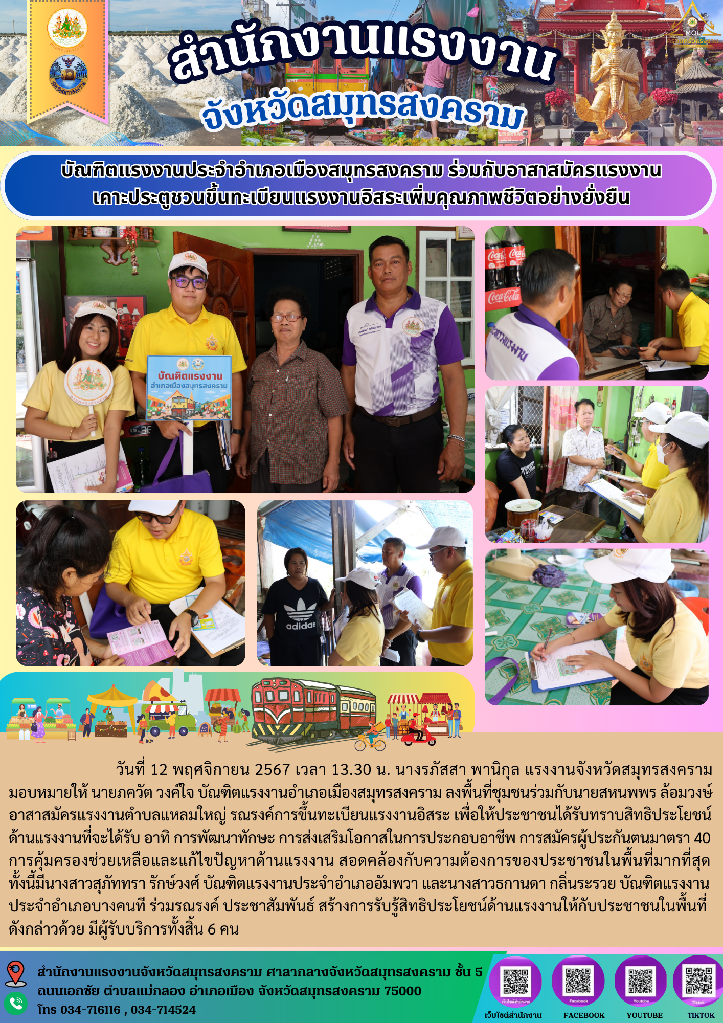 วันที่ 12 พฤศจิกายน 2567 เวลา 13.30 น. นางรภัสสา พานิกุล แรงงานจังหวัดสมุทรสงคราม มอบหมายให้ นายภควัต วงค์ใจ บัณฑิตแรงงานอำเภอเมืองสมุทรสงคราม ลงพื้นที่ชุมชนร่วมกับนายสหนพพร ล้อมวงษ์ อาสาสมัครแรงงานตำบลแหลมใหญ่ รณรงค์การขึ้นทะเบียนแรงงานอิสระ เพื่อให้ประชาชนได้รับทราบสิทธิประโยชน์ด้านแรงงานที่จะได้รับ อาทิ การพัฒนาทักษะ การส่งเสริมโอกาสในการประกอบอาชีพ การสมัครผู้ประกันตนมาตรา 40 การคุ้มครองช่วยเหลือและแก้ไขปัญหาด้านแรงงาน สอดคล้องกับความต้องการของประชาชนในพื้นที่มากที่สุด ทั้งนี้มีนางสาวสุภัททรา รักษ์วงศ์ บัณฑิตแรงงานประจำอำเภออัมพวา และนางสาวธกานดา กลิ่นระรวย บัณฑิตแรงงานประจำอำเภอบางคนที ร่วมรณรงค์ ประชาสัมพันธ์ สร้างการรับรู้สิทธิประโยชน์ด้านแรงงานให้กับประชาชนในพื้นที่ดังกล่าวด้วย มีผู้รับบริการทั้งสิ้น 6 คน