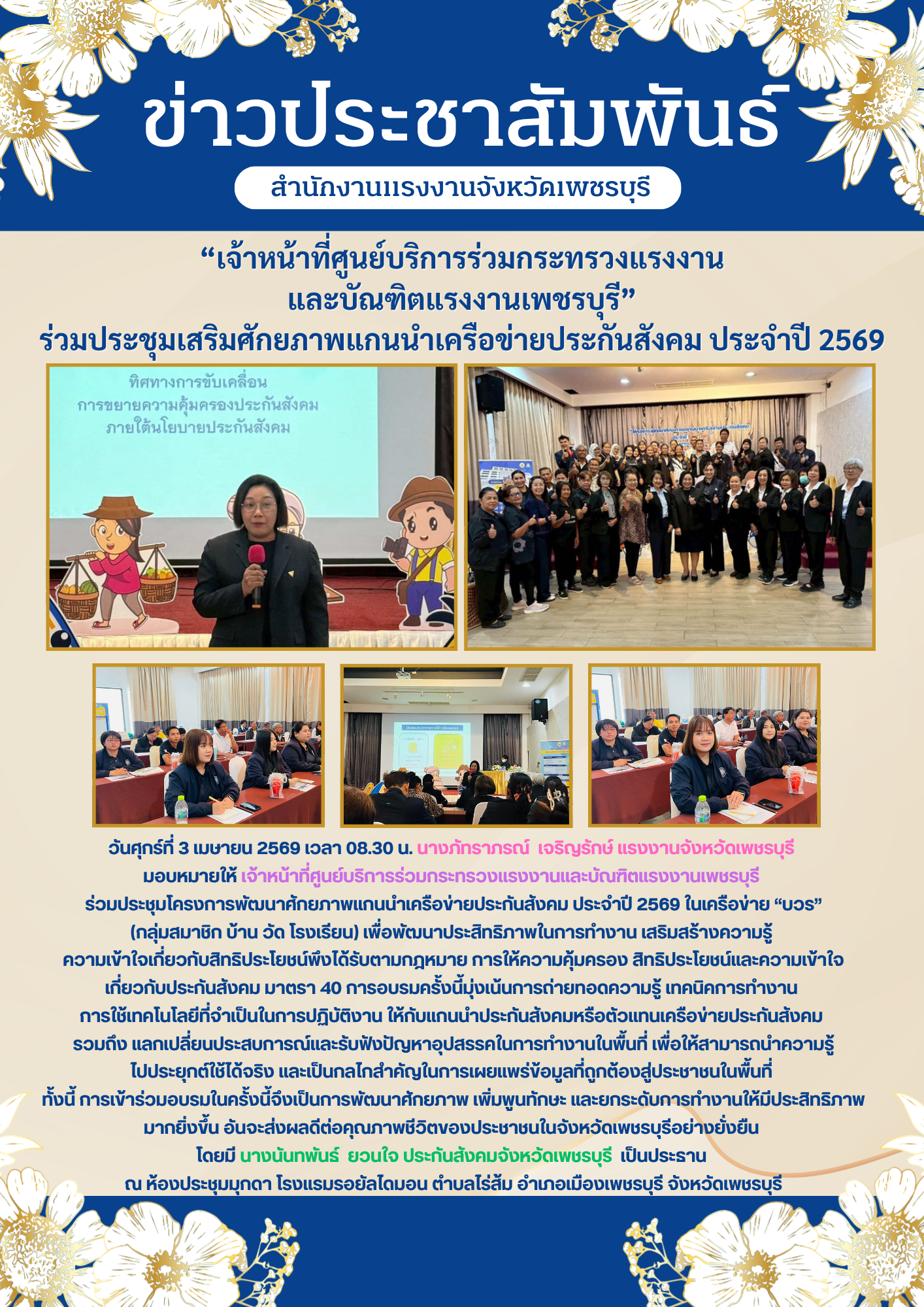 “เจ้าหน้าที่ศูนย์บริการร่วมกระทรวงแรงงาน และบัณฑิตแรงงานเพชรบุรี” ร่วมประชุมเสริมศักยภาพแกนนำเครือข่ายประกันสังคม ประจำปี 2569
