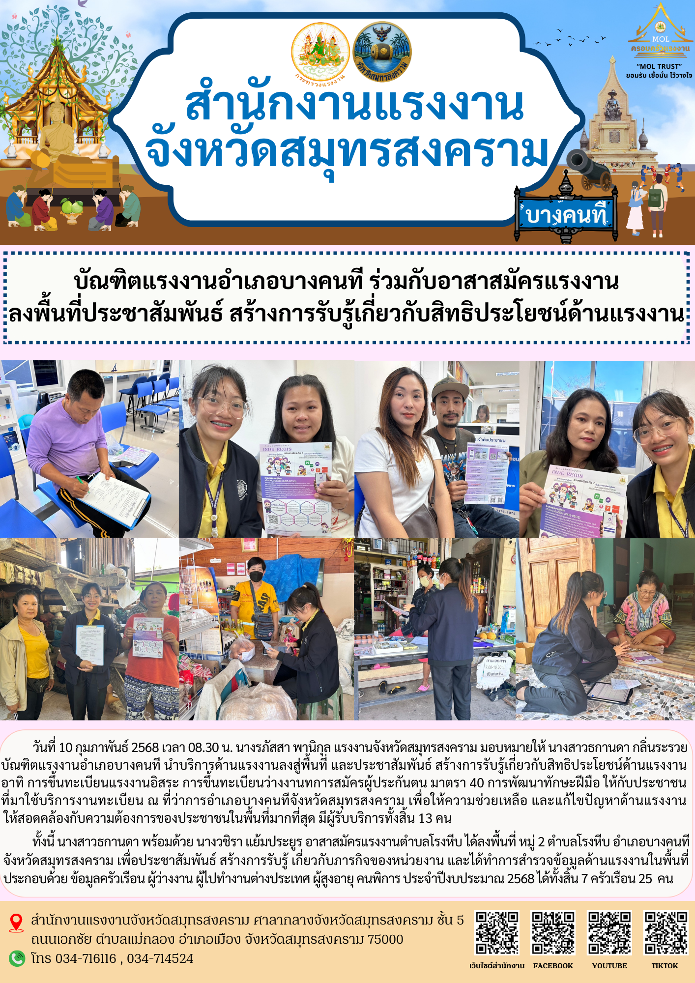 วันที่ 10 กุมภาพันธ์ 2568 เวลา 08.30 น. นางรภัสสา พานิกุล แรงงานจังหวัดสมุทรสงคราม มอบหมายให้ นางสาวธกานดา กลิ่นระรวย บัณฑิตแรงงานอำเภอบางคนที นำบริการด้านแรงงานลงสู่พื้นที่ และประชาสัมพันธ์ สร้างการรับรู้เกี่ยวกับสิทธิประโยชน์ด้านแรงงาน อาทิ การขึ้นทะเบียนแรงงานอิสระ การขึ้นทะเบียนว่างงานทการสมัครผู้ประกันตน มาตรา 40 การพัฒนาทักษะฝีมือ ให้กับประชาชนที่มาใช้บริการงานทะเบียน ณ ที่ว่าการอำเภอบางคนทีจังหวัดสมุทรสงคราม เพื่อให้ความช่วยเหลือ และแก้ไขปัญหาด้านแรงงานให้สอดคล้องกับความต้องการของประชาชนในพื้นที่มากที่สุด มีผู้รับบริการทั้งสิ้น 13 คน