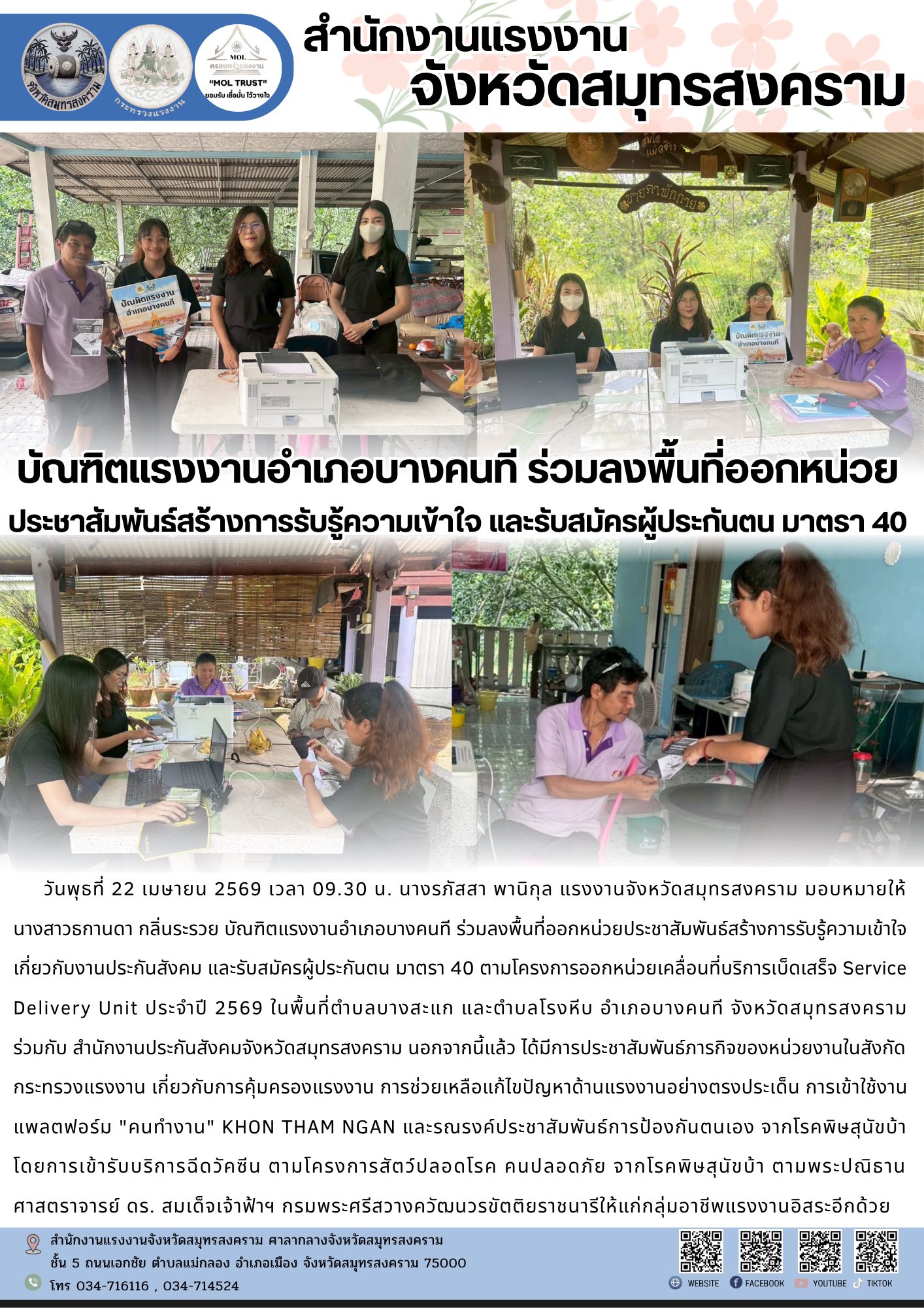 วันพุธที่ 22 เมษายน 2569 เวลา 09.30 น. นางรภัสสา พานิกุล แรงงานจังหวัดสมุทรสงคราม มอบหมายให้ นางสาวธกานดา กลิ่นระรวย บัณฑิตแรงงานอำเภอบางคนที ร่วมลงพื้นที่ออกหน่วยประชาสัมพันธ์สร้างการรับรู้ความเข้าใจ เกี่ยวกับงานประกันสังคม และรับสมัครผู้ประกันตน มาตรา 40 ตามโครงการออกหน่วยเคลื่อนที่บริการเบ็ดเสร็จ Service Delivery Unit ประจำปี 2569 ในพื้นที่ตำบลบางสะแก และตำบลโรงหีบ อำเภอบางคนที จังหวัดสมุทรสงคราม ร่วมกับ สำนักงานประกันสังคมจังหวัดสมุทรสงคราม นอกจากนี้แล้ว ได้มีการประชาสัมพันธ์ภารกิจของหน่วยงานในสังกัดกระทรวงแรงงาน เกี่ยวกับการคุ้มครองแรงงาน การช่วยเหลือแก้ไขปัญหาด้านแรงงานอย่างตรงประเด็น การเข้าใช้งานแพลตฟอร์ม “คนทำงาน” KHON THAM NGAN และรณรงค์ประชาสัมพันธ์การป้องกันตนเอง จากโรคพิษสุนัขบ้า โดยการเข้ารับบริการฉีดวัคซีน ตามโครงการสัตว์ปลอดโรค คนปลอดภัย จากโรคพิษสุนัขบ้า ตามพระปณิธาน ศาสตราจารย์ ดร. สมเด็จเจ้าฟ้าฯ กรมพระศรีสวางควัฒนวรขัตติยราชนารีให้แก่กลุ่มอาชีพแรงงานอิสระอีกด้วย