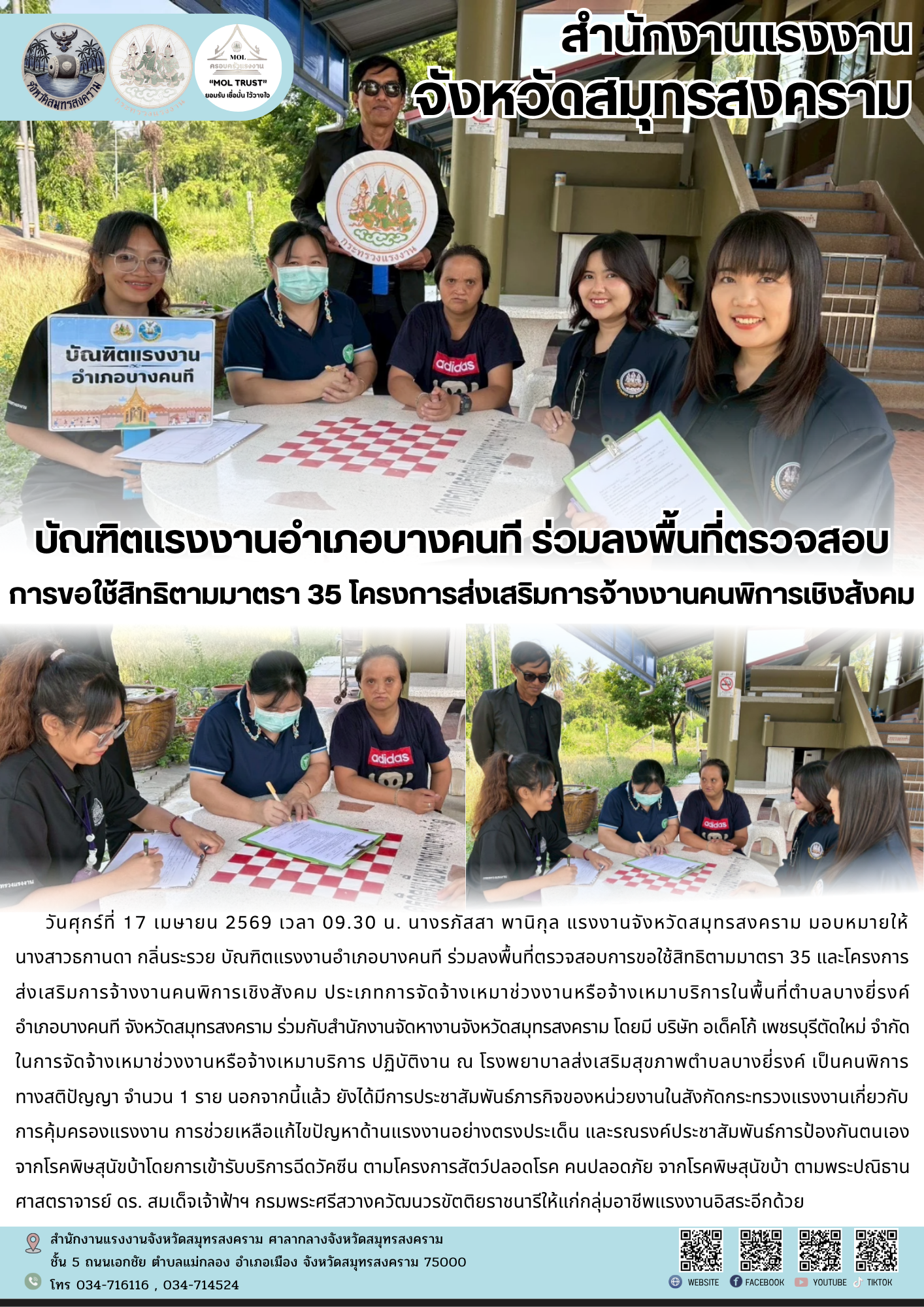 วันศุกร์ที่ 17 เมษายน 2569 เวลา 09.30 น. นางรภัสสา พานิกุล แรงงานจังหวัดสมุทรสงคราม มอบหมายให้ นางสาวธกานดา กลิ่นระรวย บัณฑิตแรงงานอำเภอบางคนที ร่วมลงพื้นที่ตรวจสอบการขอใช้สิทธิตามมาตรา 35 และโครงการส่งเสริมการจ้างงานคนพิการเชิงสังคม ประเภทการจัดจ้างเหมาช่วงงานหรือจ้างเหมาบริการในพื้นที่ตำบลบางยี่รงค์ อำเภอบางคนที จังหวัดสมุทรสงคราม ร่วมกับสำนักงานจัดหางานจังหวัดสมุทรสงคราม โดยมี บริษัท อเด็คโก้ เพชรบุรีตัดใหม่ จำกัด ในการจัดจ้างเหมาช่วงงานหรือจ้างเหมาบริการ ปฏิบัติงาน ณ โรงพยาบาลส่งเสริมสุขภาพตำบลบางยี่รงค์ เป็นคนพิการทางสติปัญญา จำนวน 1 ราย นอกจากนี้แล้ว ยังได้มีการประชาสัมพันธ์ภารกิจของหน่วยงานในสังกัดกระทรวงแรงงานเกี่ยวกับการคุ้มครองแรงงาน การช่วยเหลือแก้ไขปัญหาด้านแรงงานอย่างตรงประเด็น และรณรงค์ประชาสัมพันธ์การป้องกันตนเองจากโรคพิษสุนัขบ้าโดยการเข้ารับบริการฉีดวัคซีน ตามโครงการสัตว์ปลอดโรค คนปลอดภัย จากโรคพิษสุนัขบ้า ตามพระปณิธาน ศาสตราจารย์ ดร. สมเด็จเจ้าฟ้าฯ กรมพระศรีสวางควัฒนวรขัตติยราชนารีให้แก่กลุ่มอาชีพแรงงานอิสระอีกด้วย