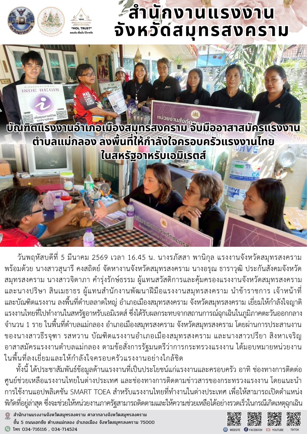 วันพฤหัสบดีที่ 5 มีนาคม 2569 เวลา 16.45 น. นางรภัสสา พานิกุล แรงงานจังหวัดสมุทรสงคราม พร้อมด้วย นางสาวสุนารี คงสถิตย์ จัดหางานจังหวัดสมุทรสงคราม นางอรุณ ธาราวุฒิ ประกันสังคมจังหวัดสมุทรสงคราม นางสาวจิดาภา คำรุ่งรักษ์ธรรม ผู้แทนสวัสดิการและคุ้มครองแรงงานจังหวัดสมุทรสงครามและนางปริษา สินเมธาธร ผู้แทนสำนักงานพัฒนาฝีมือแรงงานสมุทรสงคราม นำข้าราชการ เจ้าหน้าที่ และบัณฑิตแรงงาน ลงพื้นที่ตำบลลาดใหญ่ อำเภอเมืองสมุทรสงคราม จังหวัดสมุทรสงคราม เยี่ยมให้กำลังใจญาติแรงงานไทยที่ไปทำงานในสหรัฐอาหรับเอมิเรตส์ ซึ่งได้รับผลกระทบจากสถานการณ์ฉุกเฉินในภูมิภาคตะวันออกกลาง จำนวน 1 ราย ในพื้นที่ตำบลแม่กลอง อำเภอเมืองสมุทรสงคราม จังหวัดสมุทรสงคราม โดยผ่านการประสานงานของนางสาวธีรจุฑา รสหวาน บัณฑิตแรงงานอำเภอเมืองสมุทรสงคราม และนางสาวปรียา สิงหาเจริญ อาสาสมัครแรงงานตำบลแม่กลอง ตามข้อสั่งการรัฐมนตรีว่าการกระทรวงแรงงาน ได้มอบหมายหน่วยงานในพื้นที่ลงเยี่ยมและให้กำลังใจครอบครัวแรงงานอย่างใกล้ชิด