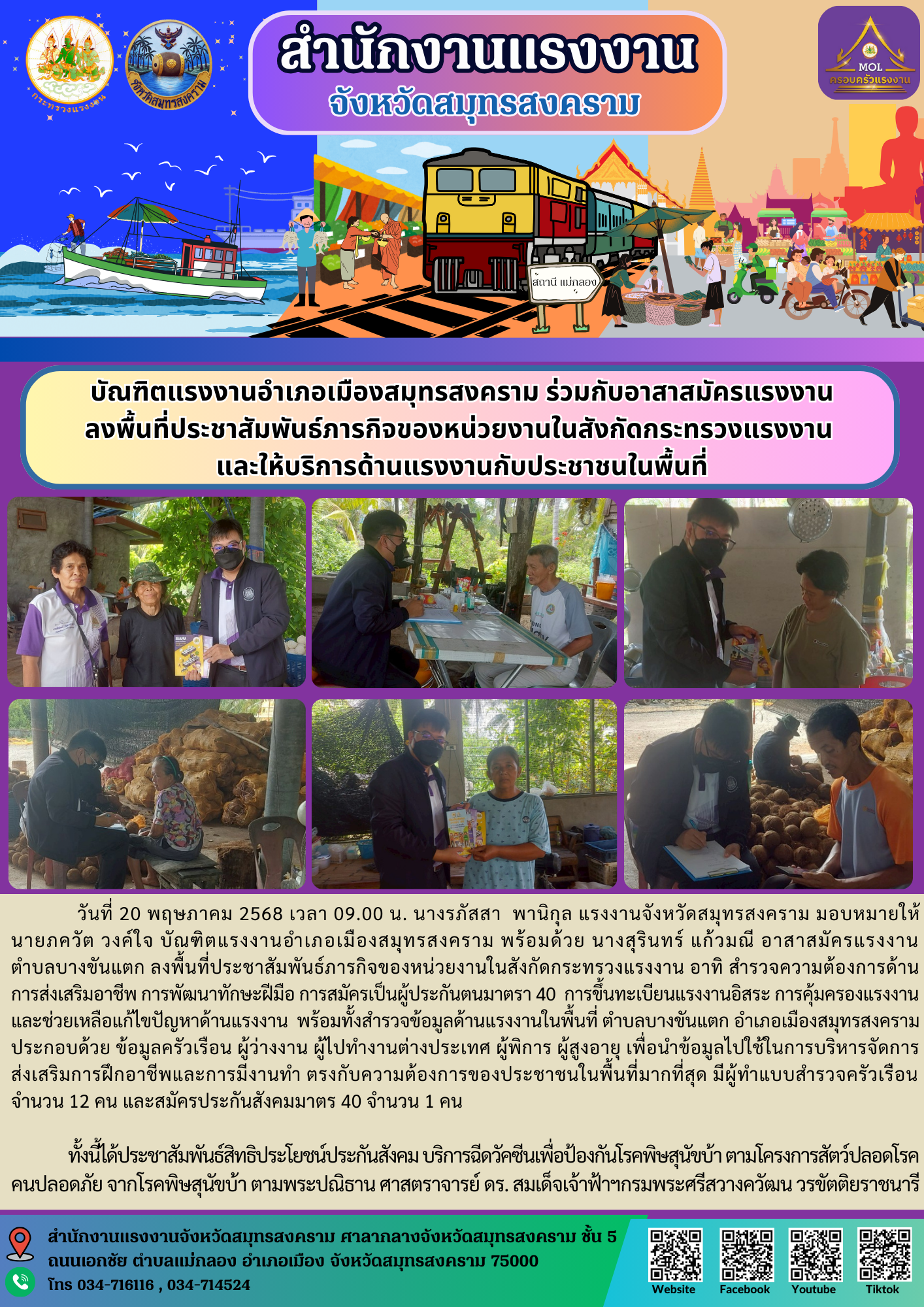 วันที่ 20 พฤษภาคม 2568 เวลา 09.00 น. นางรภัสสา พานิกุล แรงงานจังหวัดสมุทรสงคราม มอบหมายให้ นายภควัต วงค์ใจ บัณฑิตแรงงานอำเภอเมืองสมุทรสงคราม พร้อมด้วย นางสุรินทร์ แก้วมณี อาสาสมัครแรงงานตำบลบางขันแตก ลงพื้นที่ประชาสัมพันธ์ภารกิจของหน่วยงานในสังกัดกระทรวงแรงงาน อาทิ สำรวจความต้องการด้านการส่งเสริมอาชีพ การพัฒนาทักษะฝีมือ การสมัครเป็นผู้ประกันตนมาตรา 40 การขึ้นทะเบียนแรงงานอิสระ การคุ้มครองแรงงาน และช่วยเหลือแก้ไขปัญหาด้านแรงงาน พร้อมทั้งสำรวจข้อมูลด้านแรงงานในพื้นที่ ตำบลบางขันแตก อำเภอเมืองสมุทรสงคราม ประกอบด้วย ข้อมูลครัวเรือน ผู้ว่างงาน ผู้ไปทำงานต่างประเทศ ผู้พิการ ผู้สูงอายุ เพื่อนำข้อมูลไปใช้ในการบริหารจัดการ ส่งเสริมการฝึกอาชีพและการมีงานทำ ตรงกับความต้องการของประชาชนในพื้นที่มากที่สุด มีผู้ทำแบบสำรวจครัวเรือนจำนวน 12 คน และสมัครประกันสังคมมาตร 40 จำนวน 1 คน