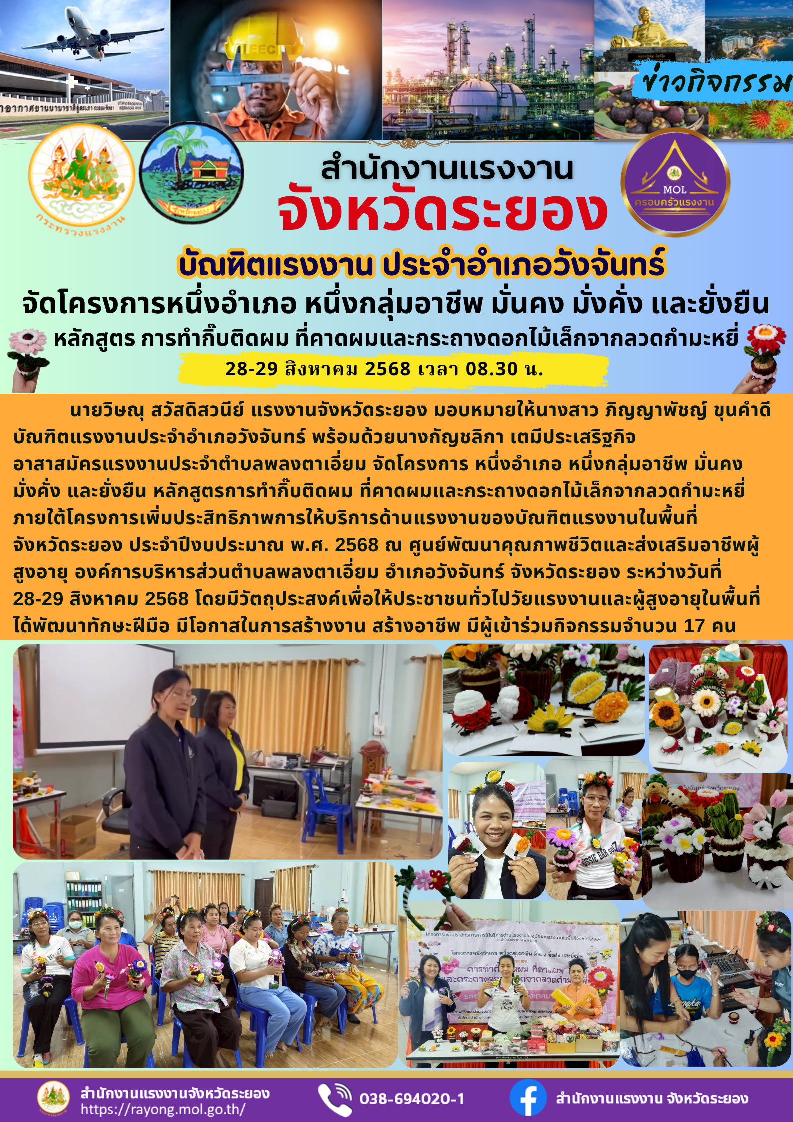 นายวิษณุ สวัสดิสวนีย์ แรงงานจังหวัดระยอง มอบหมายให้นางสาว ภิญญาพัชญ์ ขุนคำดี บัณฑิตแรงงานประจำอำเภอวังจันทร์ พร้อมด้วยนางกัญชลิกา เตมีประเสริฐกิจ อาสาสมัครแรงงานประจำตำบลพลงตาเอี่ยม จัดโครงการ หนึ่งอำเภอ หนึ่งกลุ่มอาชีพ มั่นคง มั่งคั่ง และยั่งยืน หลักสูตรการทำกิ๊บติดผม ที่คาดผมและกระถางดอกไม้เล็กจากลวดกำมะหยี่ ภายใต้โครงการเพิ่มประสิทธิภาพการให้บริการด้านแรงงานของบัณฑิตแรงงานในพื้นที่ จังหวัดระยอง ประจำปีงบประมาณ พ.ศ. 2568 ณ ศูนย์พัฒนาคุณภาพชีวิตและส่งเสริมอาชีพผู้สูงอายุ องค์การบริหารส่วนตำบลพลงตาเอี่ยม อำเภอวังจันทร์ จังหวัดระยอง ระหว่างวันที่ 28-29 สิงหาคม 2568 โดยมีวัตถุประสงค์เพื่อให้ประชาชนทั่วไปวัยแรงงานและผู้สูงอายุในพื้นที่ ได้พัฒนาทักษะฝีมือ มีโอกาสในการสร้างงาน สร้างอาชีพ มีผู้เข้าร่วมกิจกรรมจำนวน 17 คน