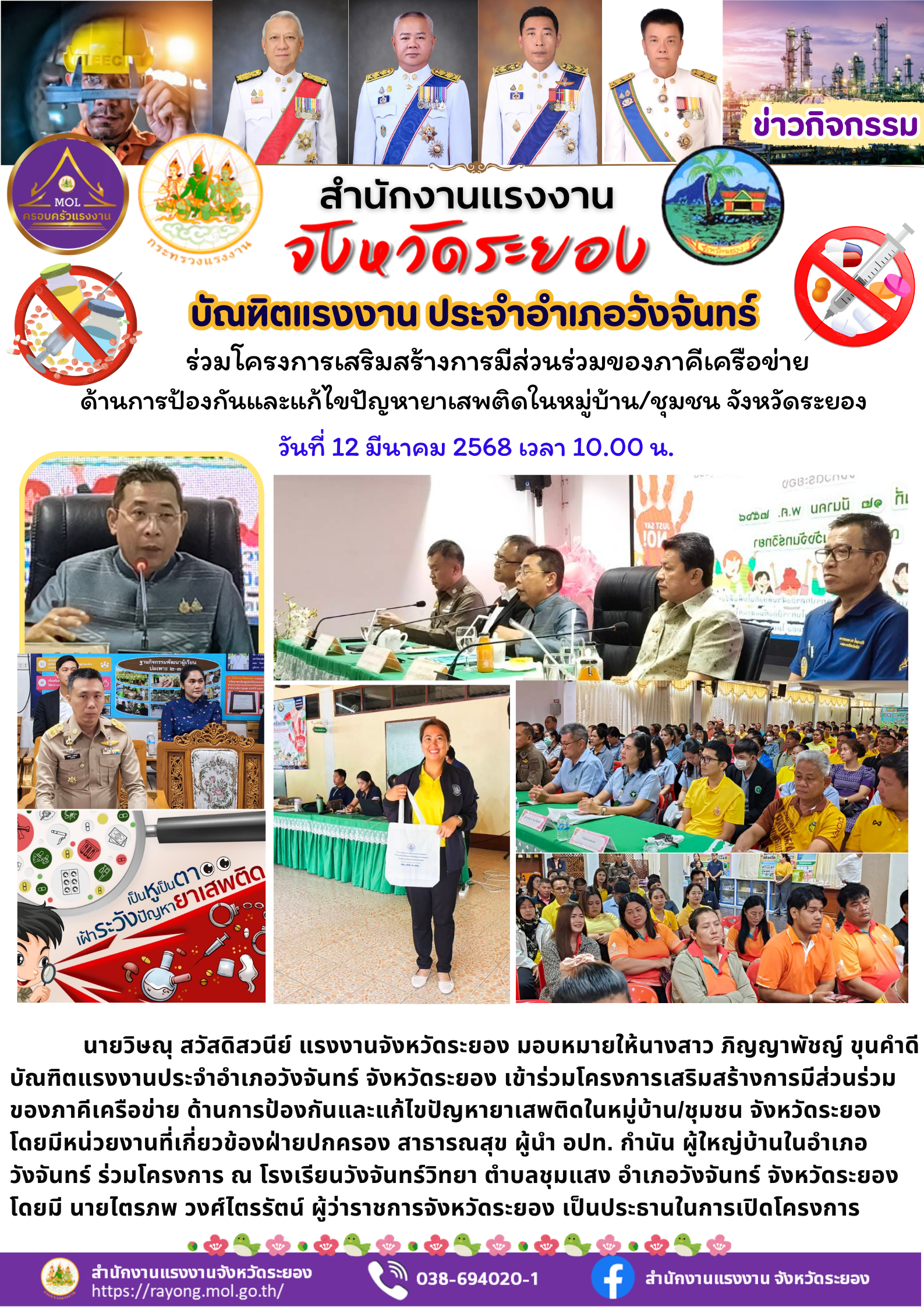 นายวิษณุ สวัสดิสวนีย์ แรงงานจังหวัดระยอง มอบหมายให้นางสาว ภิญญาพัชญ์ ขุนคำดี บัณฑิตแรงงานประจำอำเภอวังจันทร์ จังหวัดระยอง เข้าร่วมโครงการเสริมสร้างการมีส่วนร่วมของภาคีเครือข่าย ด้านการป้องกันและแก้ไขปัญหายาเสพติดในหมู่บ้าน/ชุมชน จังหวัดระยอง โดยมีหน่วยงานที่เกี่ยวข้องฝ่ายปกครอง สาธารณสุข ผู้นำ อปท. กำนัน ผู้ใหญ่บ้านในอำเภอ วังจันทร์ ร่วมโครงการ ณ โรงเรียนวังจันทร์วิทยา ตำบลชุมแสง อำเภอวังจันทร์ จังหวัดระยอง โดยมี นายไตรภพ วงศ์ไตรรัตน์ ผู้ว่าราชการจังหวัดระยอง เป็นประธานในการเปิดโครงการ