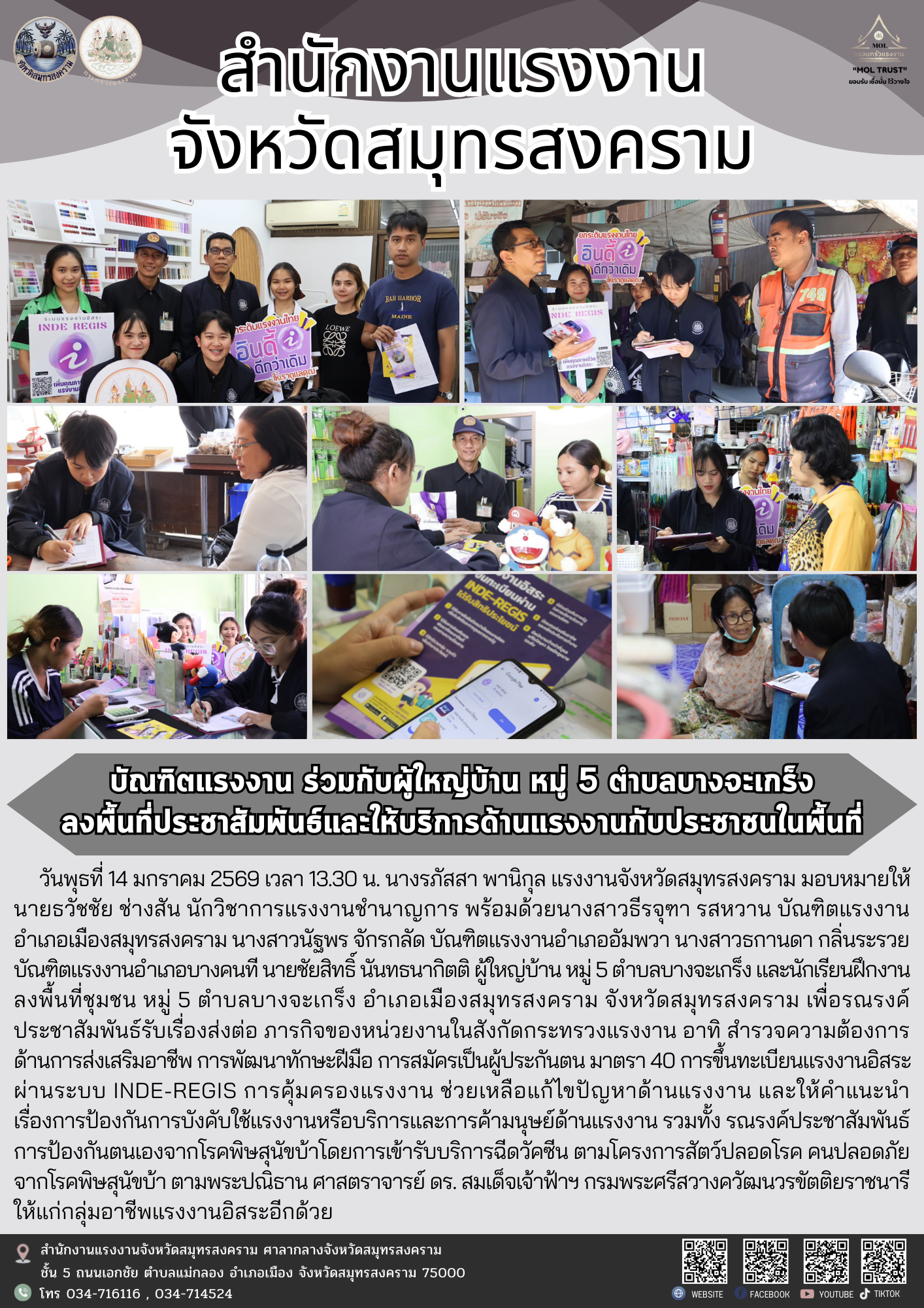 วันพุธที่ 14 มกราคม 2569 เวลา 13.30 น. นางรภัสสา พานิกุล แรงงานจังหวัดสมุทรสงคราม มอบหมายให้ นายธวัชชัย ช่างสัน นักวิชาการแรงงานชำนาญการ พร้อมด้วยนางสาวธีรจุฑา รสหวาน บัณฑิตแรงงานอำเภอเมืองสมุทรสงคราม นางสาวนัฐพร จักรกลัด บัณฑิตแรงงานอำเภออัมพวา นางสาวธกานดา กลิ่นระรวย บัณฑิตแรงงานอำเภอบางคนที นายชัยสิทธิ์ นันทธนากิตติ ผู้ใหญ่บ้าน หมู่ 5 ตำบลบางจะเกร็ง และนักเรียนฝึกงาน ลงพื้นที่ชุมชน หมู่ 5 ตำบลบางจะเกร็ง อำเภอเมืองสมุทรสงคราม จังหวัดสมุทรสงคราม เพื่อรณรงค์ประชาสัมพันธ์รับเรื่องส่งต่อ ภารกิจของหน่วยงานในสังกัดกระทรวงแรงงาน อาทิ สำรวจความต้องการด้านการส่งเสริมอาชีพ การพัฒนาทักษะฝีมือ การสมัครเป็นผู้ประกันตน มาตรา 40 การขึ้นทะเบียนแรงงานอิสระผ่านระบบ INDE-REGIS การคุ้มครองแรงงาน ช่วยเหลือแก้ไขปัญหาด้านแรงงาน และให้คำแนะนำเรื่องการป้องกันการบังคับใช้แรงงานหรือบริการและการค้ามนุษย์ด้านแรงงาน รวมทั้ง รณรงค์ประชาสัมพันธ์การป้องกันตนเองจากโรคพิษสุนัขบ้าโดยการเข้ารับบริการฉีดวัคซีน ตามโครงการสัตว์ปลอดโรค คนปลอดภัยจากโรคพิษสุนัขบ้า ตามพระปณิธาน ศาสตราจารย์ ดร. สมเด็จเจ้าฟ้าฯ กรมพระศรีสวางควัฒนวรขัตติยราชนารี ให้แก่กลุ่มอาชีพแรงงานอิสระอีกด้วย