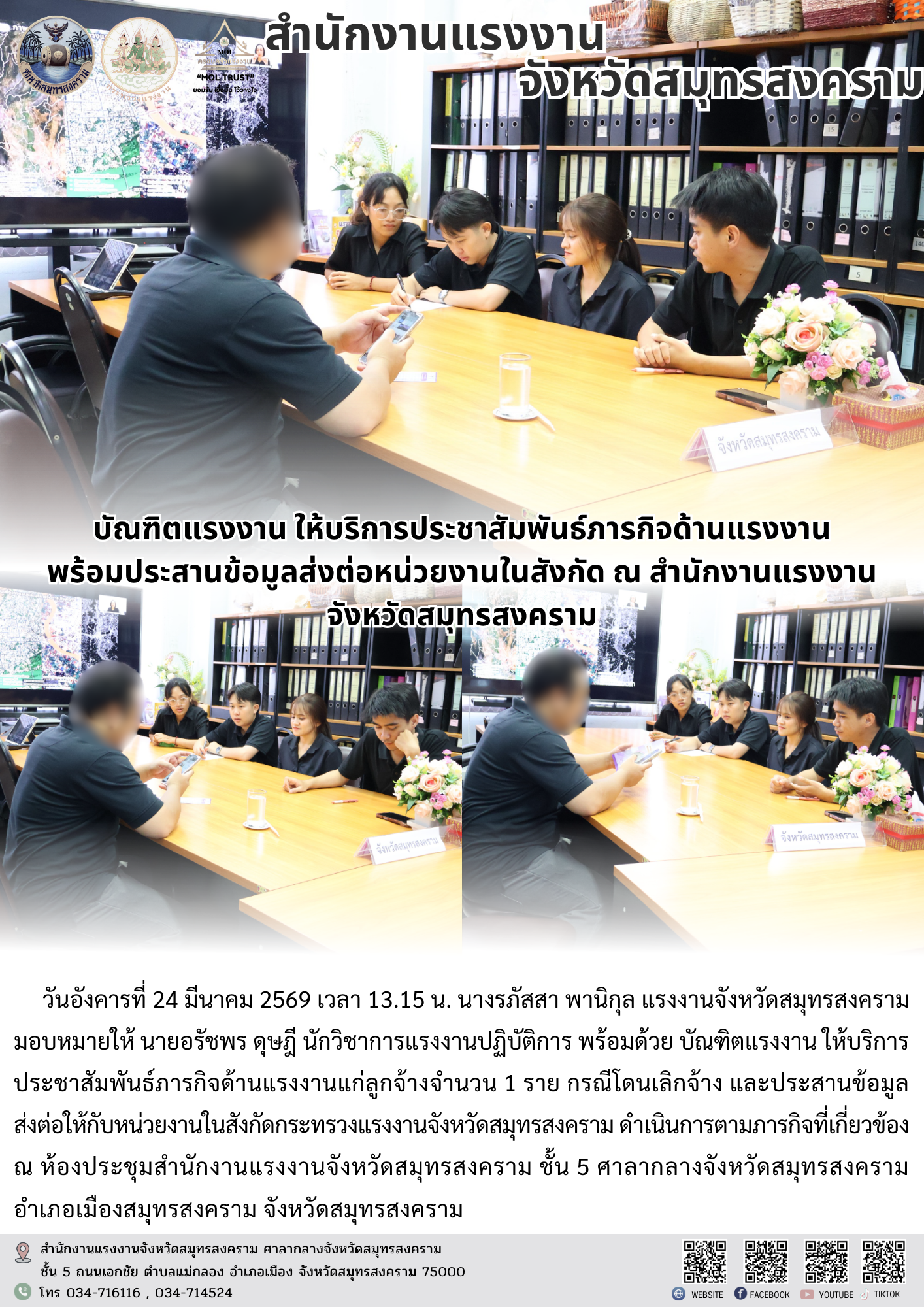 วันอังคารที่ 24 มีนาคม 2569 เวลา 13.15 น. นางรภัสสา พานิกุล แรงงานจังหวัดสมุทรสงคราม มอบหมายให้ นายอรัชพร ดุษฎี นักวิชาการแรงงานปฏิบัติการ พร้อมด้วย บัณฑิตแรงงาน ให้บริการประชาสัมพันธ์ภารกิจด้านแรงงานแก่ลูกจ้างจำนวน 1 ราย กรณีโดนเลิกจ้าง และประสานข้อมูลส่งต่อให้กับหน่วยงานในสังกัดกระทรวงแรงงานจังหวัดสมุทรสงคราม ดำเนินการตามภารกิจที่เกี่ยวข้อง ณ ห้องประชุมสำนักงานแรงงานจังหวัดสมุทรสงคราม ชั้น 5 ศาลากลางจังหวัดสมุทรสงคราม อำเภอเมืองสมุทรสงคราม จังหวัดสมุทรสงคราม